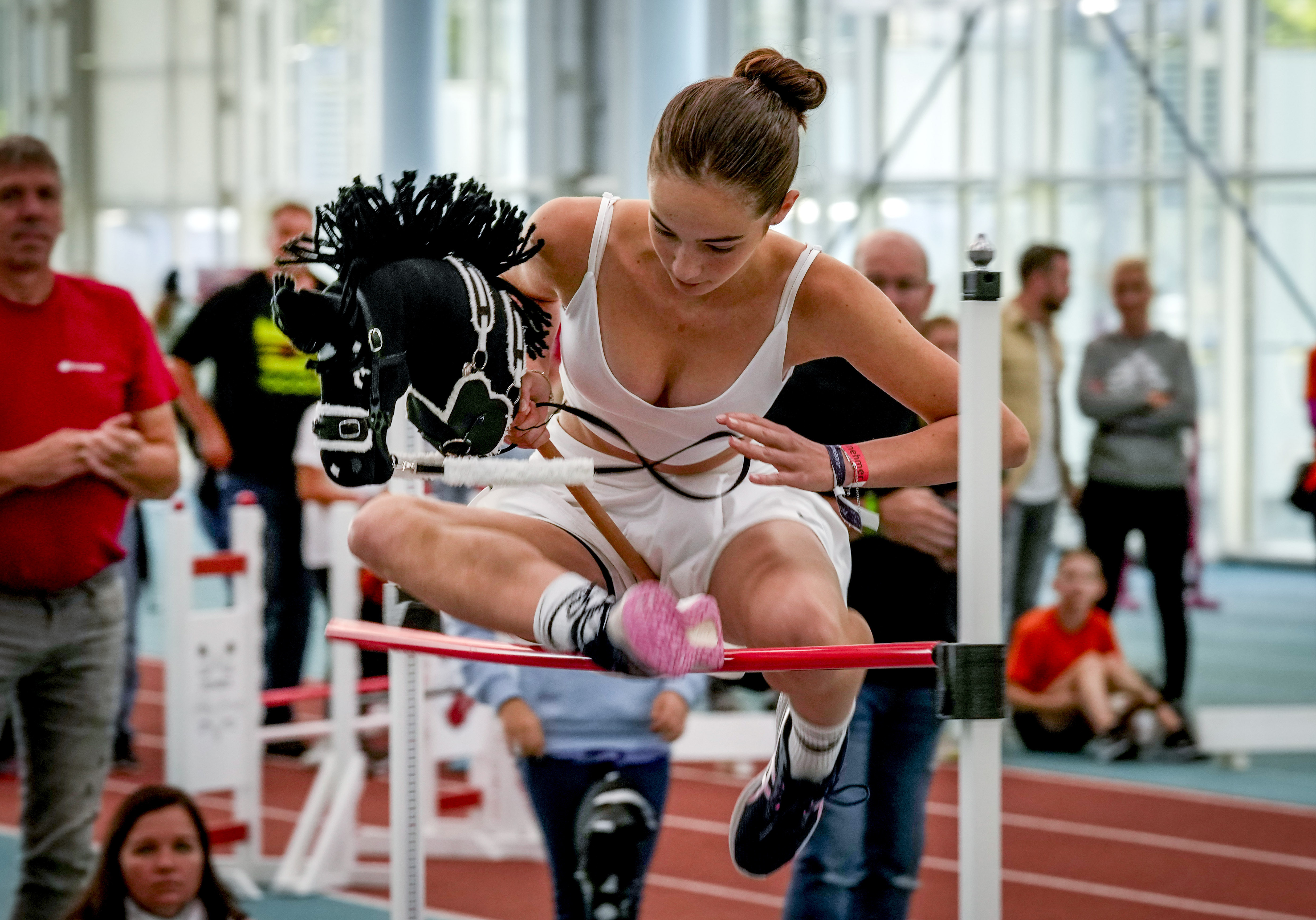 A girl clears the bar during the first German Hobby Horsing Championship in Frankfurt, Germany, Saturday, September 14, 2024. (Photo by Michael Probst/AP Photo)