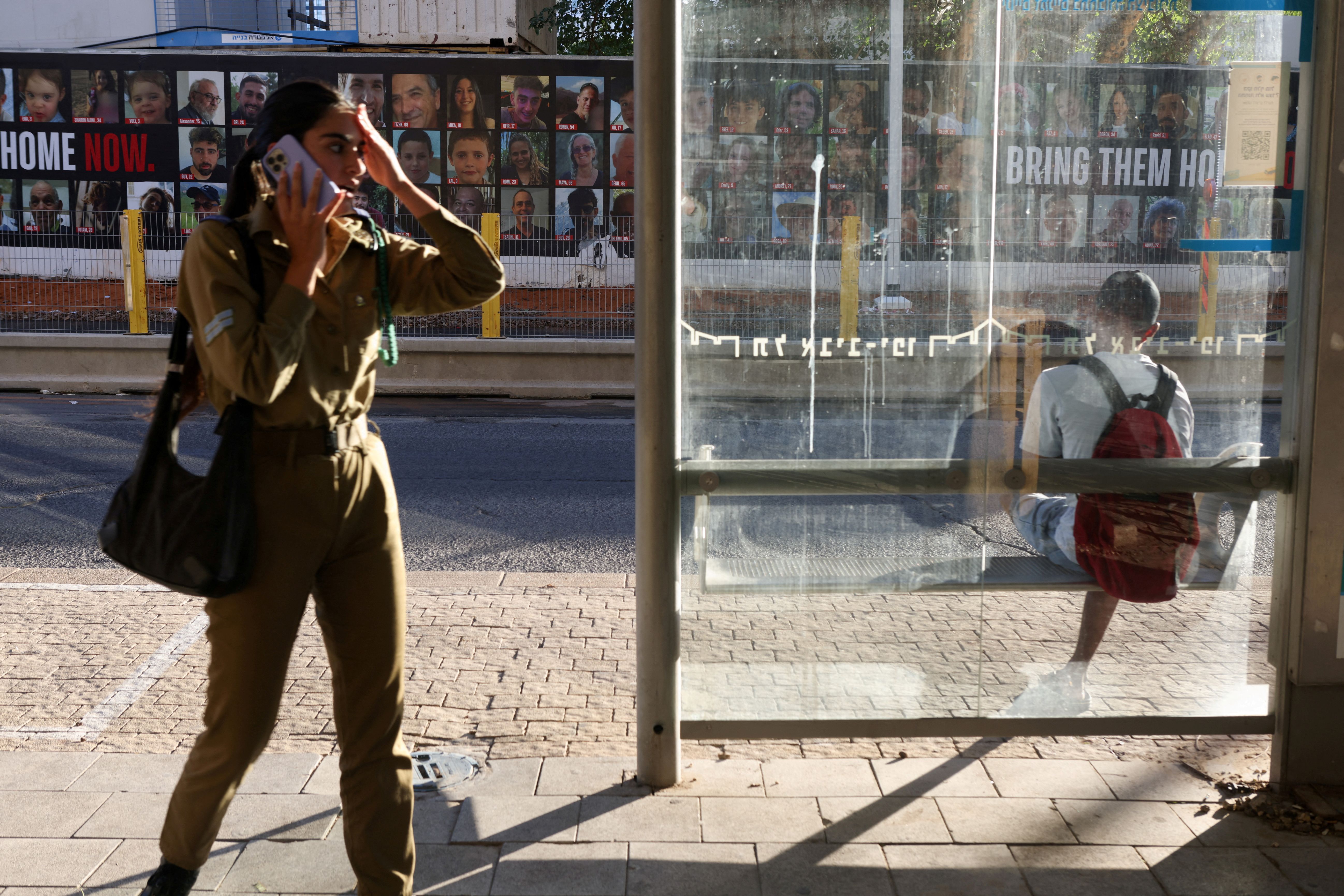People wait for a bus near images of those taken hostage or killed during the deadly October 7 attack, amid the ongoing conflict in Gaza between Israel and Hamas, in Tel Aviv, Israel on September 17, 2024. (Photo by Jim Urquhart/Reuters)