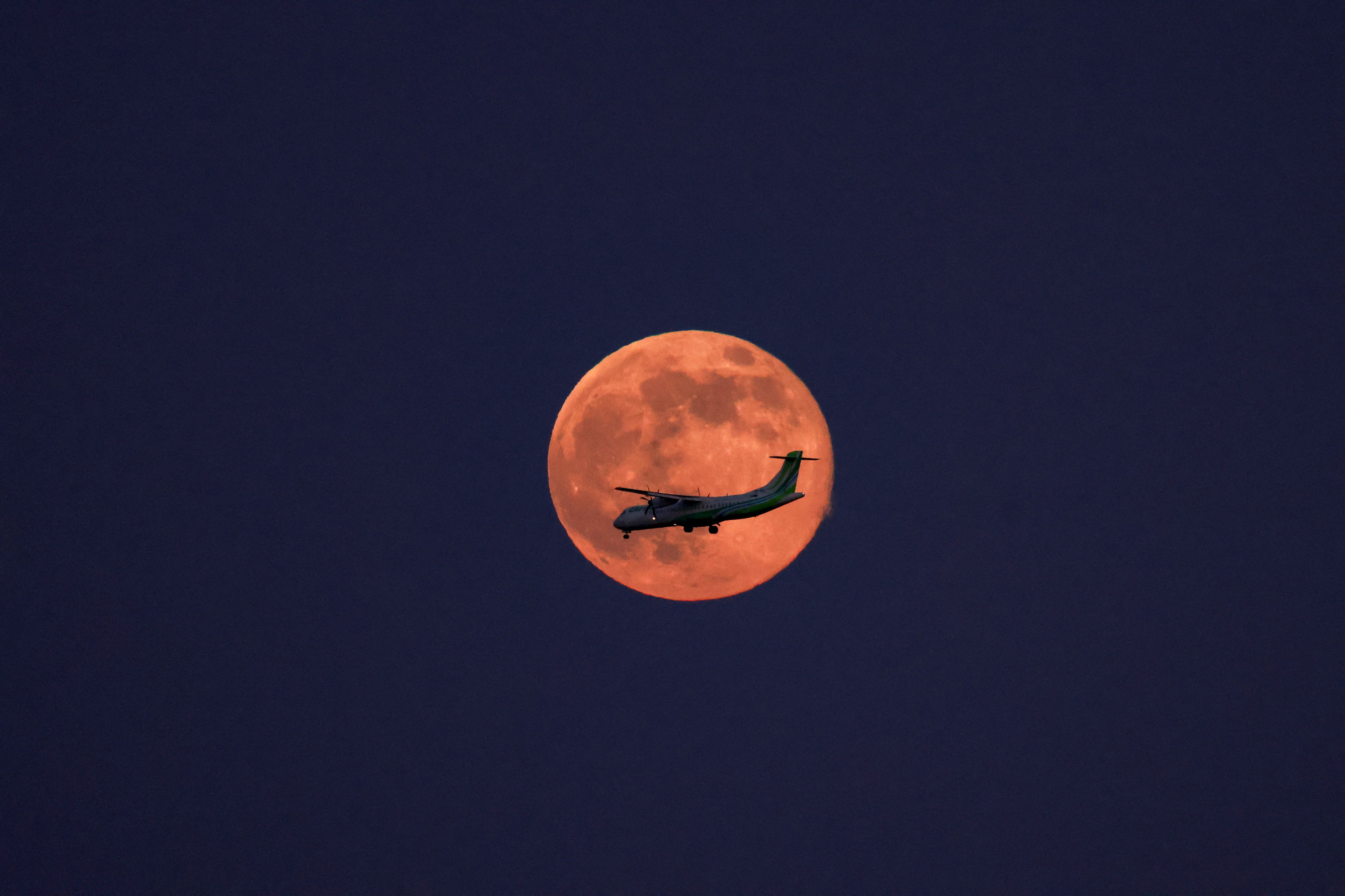 A Binter company's plane crosses the supermoon known as the “Hunter's Moon”, in Aguimes on the island of Gran Canaria, Spain, on November 5, 2025. (Photo by Borja Suarez/Reuters)