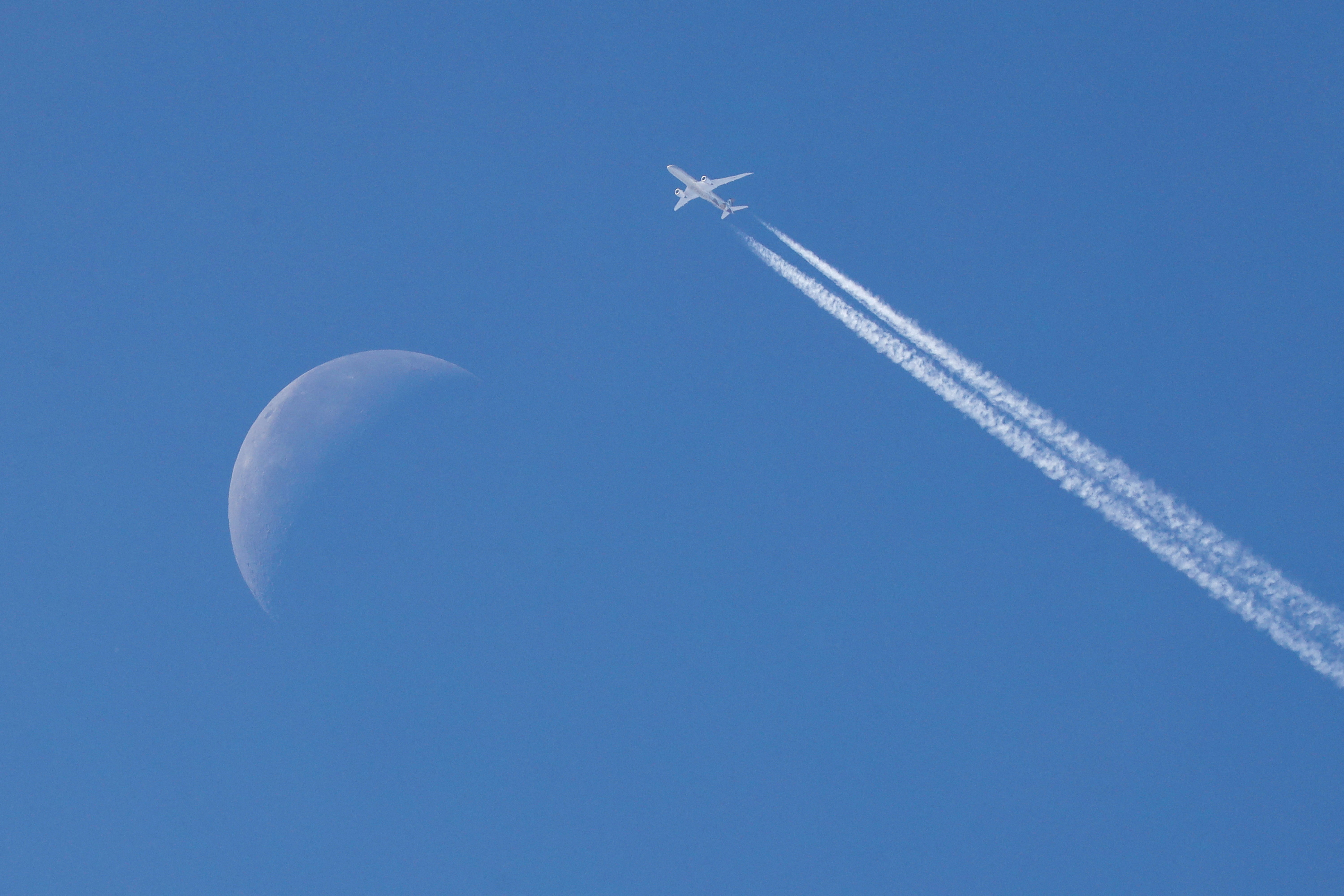 A passenger plane flies in the sky past the moon in the background over Belgrade, Serbia on September 16, 2025. (Photo by Fedja Grulovic/Reuters)
