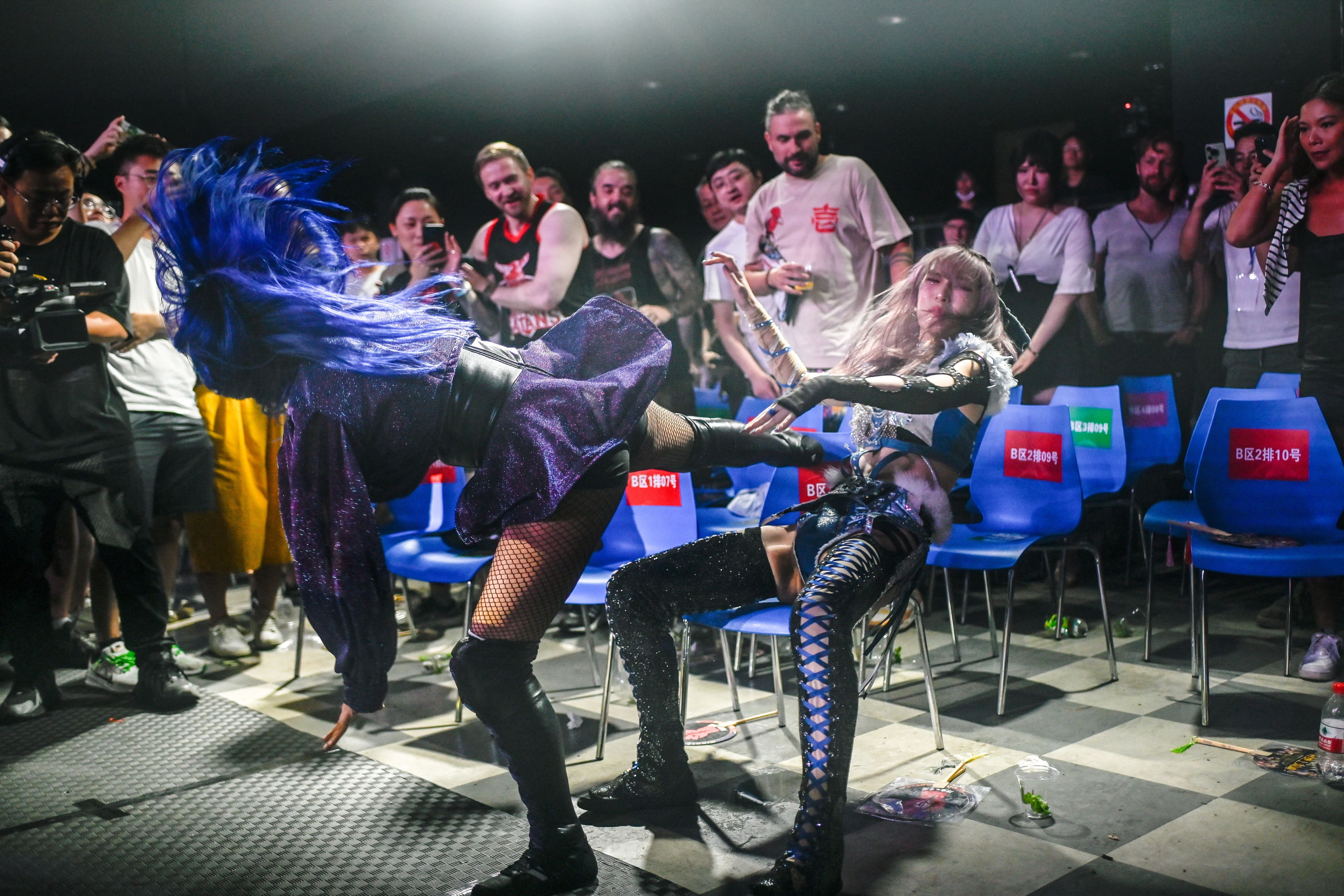 This picture taken on September 14, 2024 shows Japanese wrestler Yuki Kamifuku (R) fighting her opponent “Crystal” of the Philippines during a Middle Kingdom Wrestling (MKW) championship event in Shanghai. Despite a promising potential domestic market, the Chinese pro wrestling community has been battling for recognition and financial stability for decades. (Photo by Wang Zhao/AFP Photo)