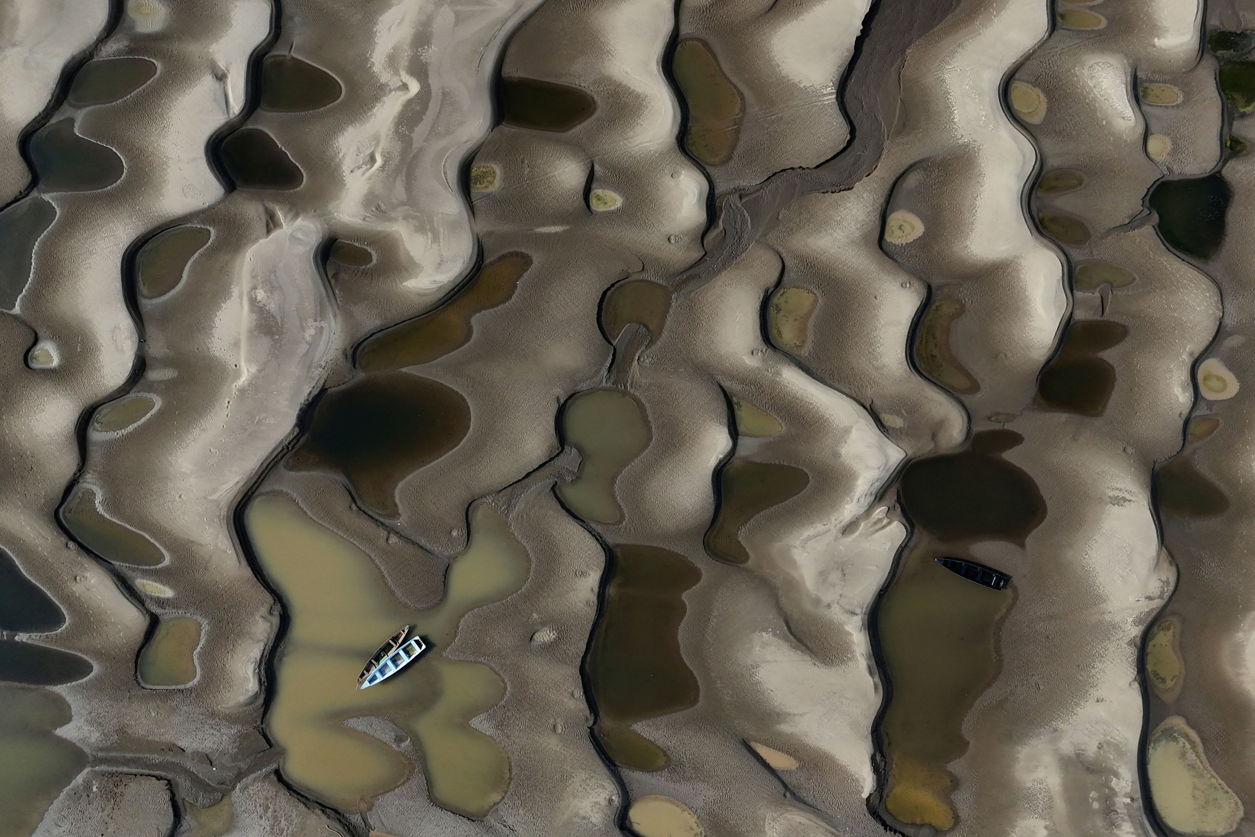 A drone view shows stranded boats over the sandbanks exposed due to drought at the Solimoes River, one of the largest tributaries of the Amazon River, during the most intense and widespread drought Brazil has experienced since records began in 1950, near Manacapuru, Amazonas state, Brazil on September 30, 2024. (Photo by Bruno Kelly/Reuters)