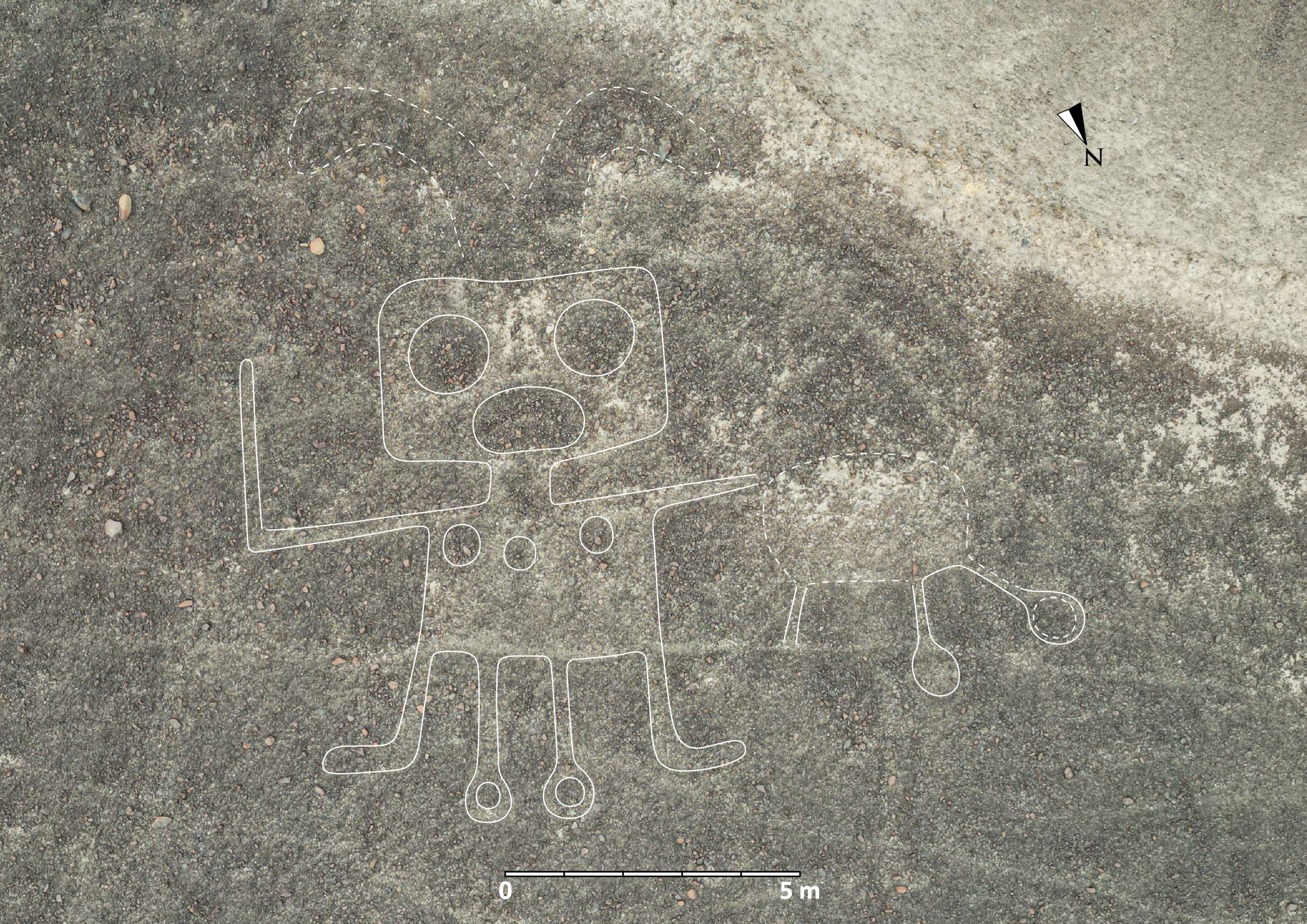 This undated handout picture released by Yamagata University shows one of 303 new geoglyphs discovered by scientists at Yamagata University in Japan, where a team of researchers applied AI-assisted image analysis of aerial photographs, which accelerated the pace of geoglyph discovery during a 6-month fieldwork in the Nazca Pampas. The famous Nazca Lines, recognized as a World Heritage Site by UNESCO, are geoglyphs more than 2,000 years old with geometric and animal figures that can only be seen from the sky. (Photo by Yamagata University/Handout via AFP Photo)