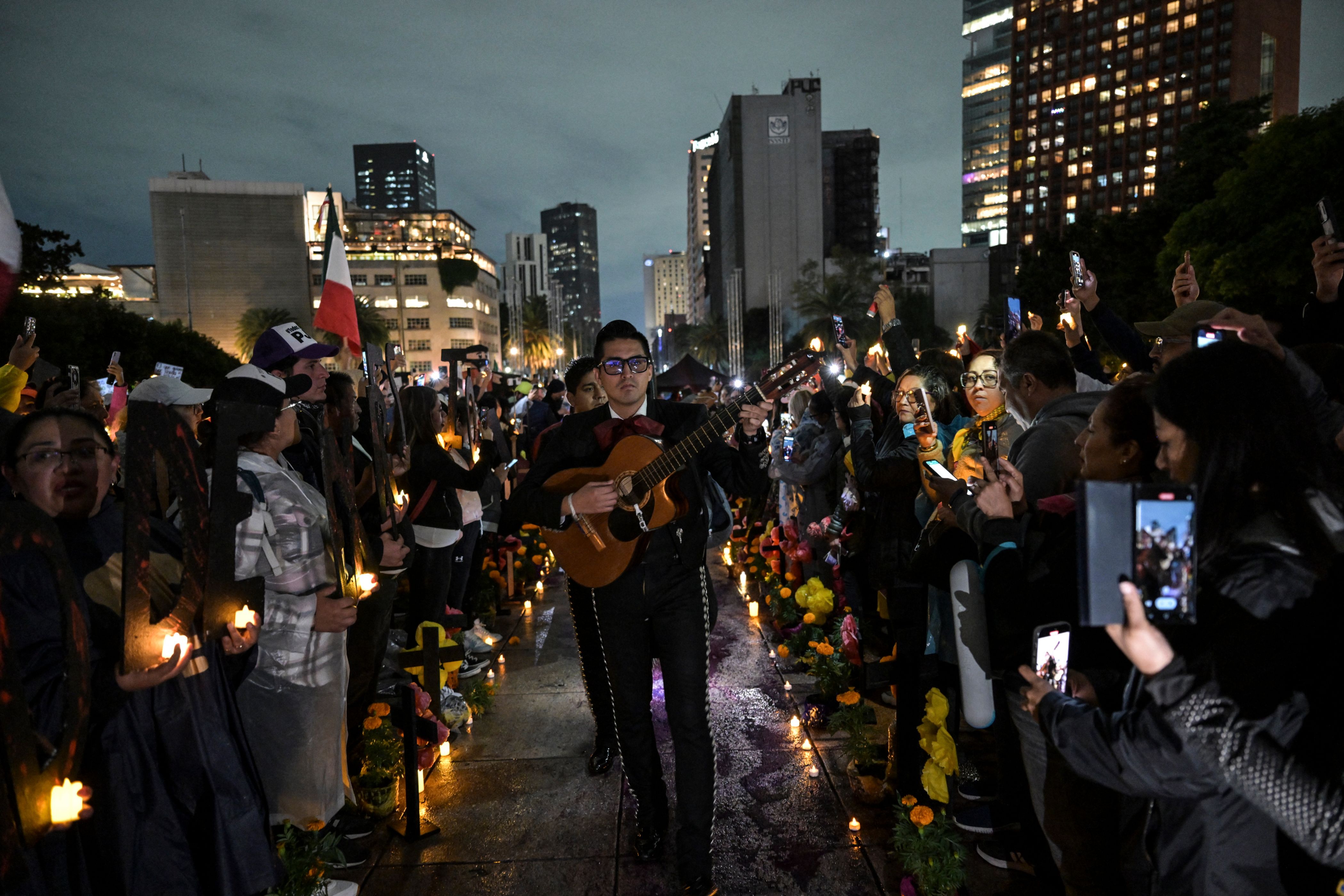 A Mariachi performs as judicial employees protest at the Revolucion monument in Mexico City on September 30, 2024. During the protest, called “Mega Altar of the Dead, The Legacy of the Sexenio”, judicial workers protested against the outgoing Mexican President Andres Manuel Lopez Obrador. (Photo by Yuri Cortéz/AFP Photo)