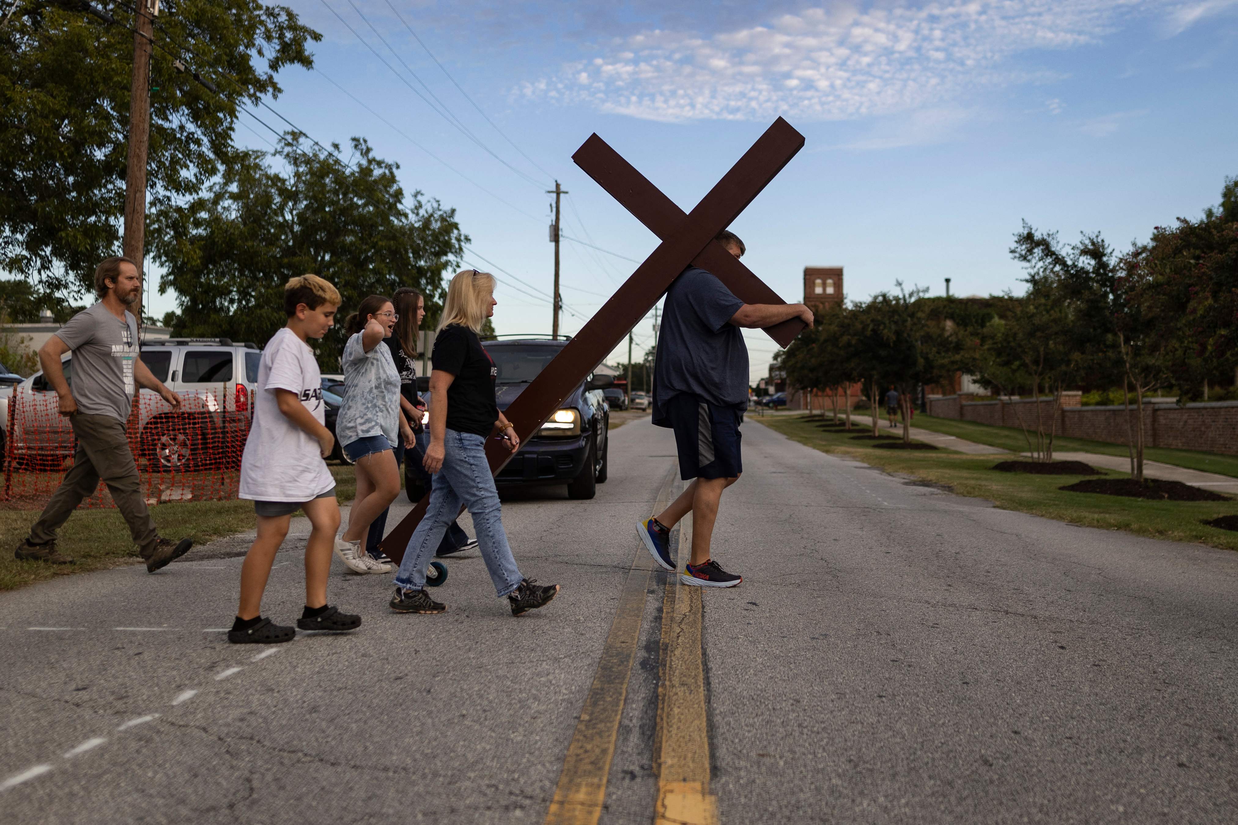 A man carries a large cross to a vigil for the Apalachee High School shooting at Jug Tavern Park in Winder, Georgia, on September 4, 2024. A 14-year-old gunman killed at least four people, including two students, and wounded nine more when he opened fire at a high school in the US state of Georgia on September 4, law enforcement said. The shooter – also a student at the school – was taken into custody. He will be charged with murder and tried as an adult, the Georgia Bureau of Investigation said. Two teachers were also among the dead. (Photo by Christian Monterrosa/AFP Photo)