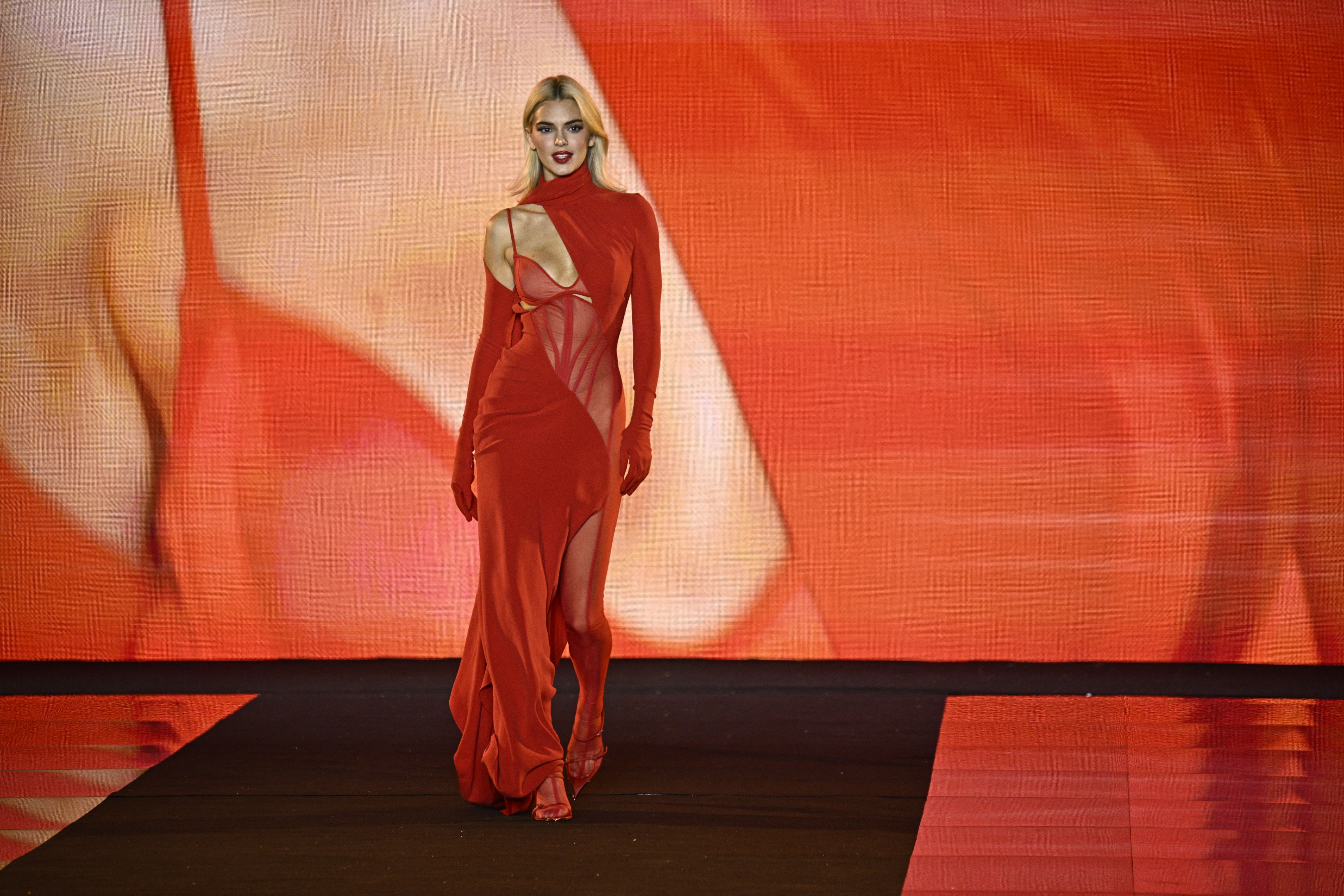 US top model Kendall Jenner presents a creation for L'Oreal Paris show “Walk Your Worth” as part of the Paris Fashion Week Women Ready-to-wear Spring-Summer 2025 collection at Palais Garnier (Opera national de Paris) opera house, in Paris on September 23, 2024. (Photo by Julien de Rosa/AFP Photo)