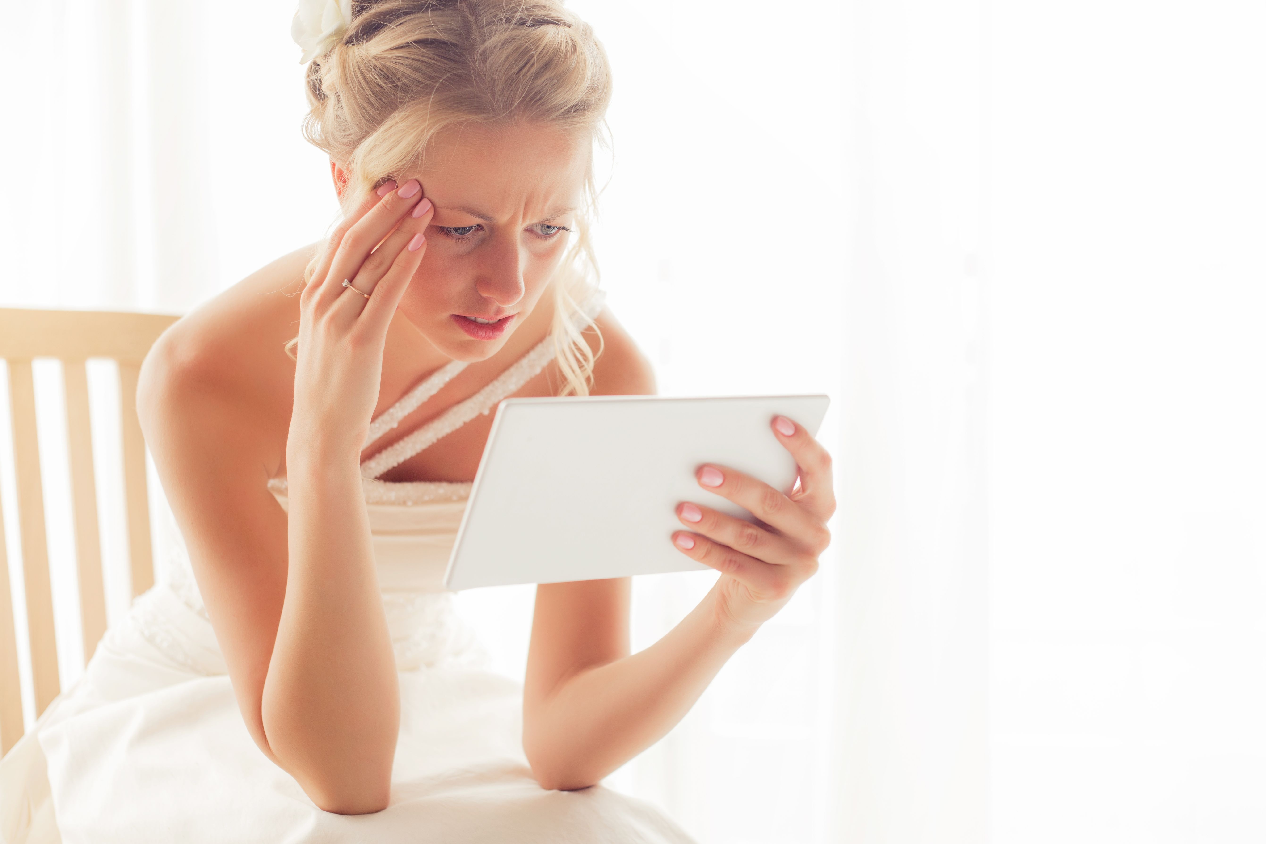 Worried bride looking at tablet. (Photo by grinvalds/Getty Images)