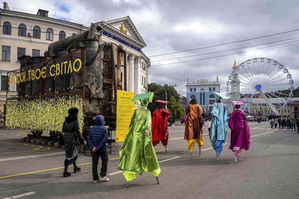 Students of Kyiv-Mohyla Academy walk by installation, which shows destroyed by Russian forces 40-ton transformer in Kyiv, Ukraine, Tuesday, October 15, 2024. (Photo by Alex Babenko/AP Photo).