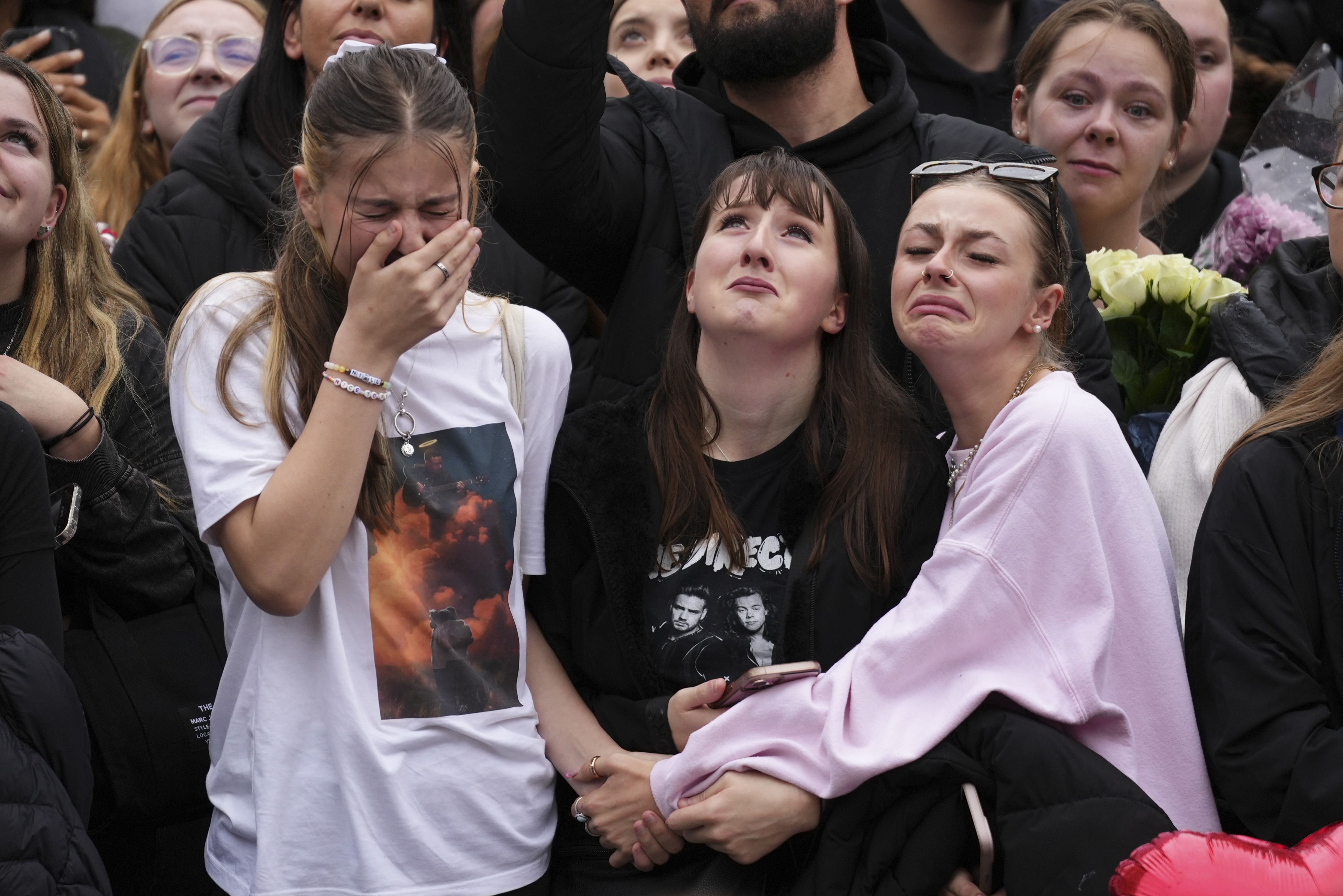 Fans react as they gather near the Peter Pan statue in Hyde Park, London to pay tribute to late British singer Liam Payne, former member of the British pop band One Direction, Sunday, October 20, 2024. (Photo by Scott A. Garfitt/Invision/AP Photo)