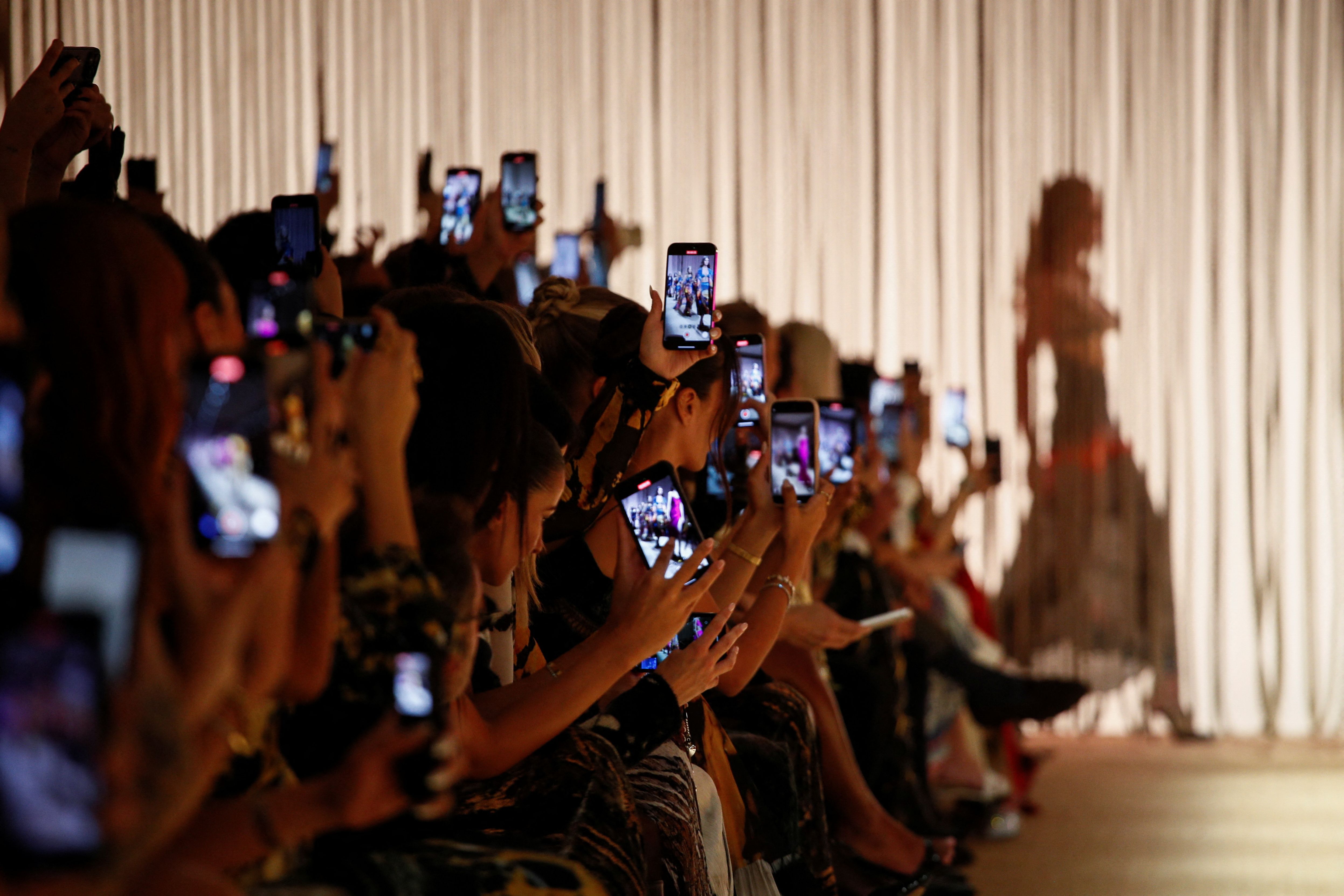 Attendees use their smartphones to record as models present creations from the Roberto Cavalli Spring/Summer 2025 collection during Fashion Week in Milan, Italy on September 18, 2024. (Photo by Alessandro Garofalo/Reuters)