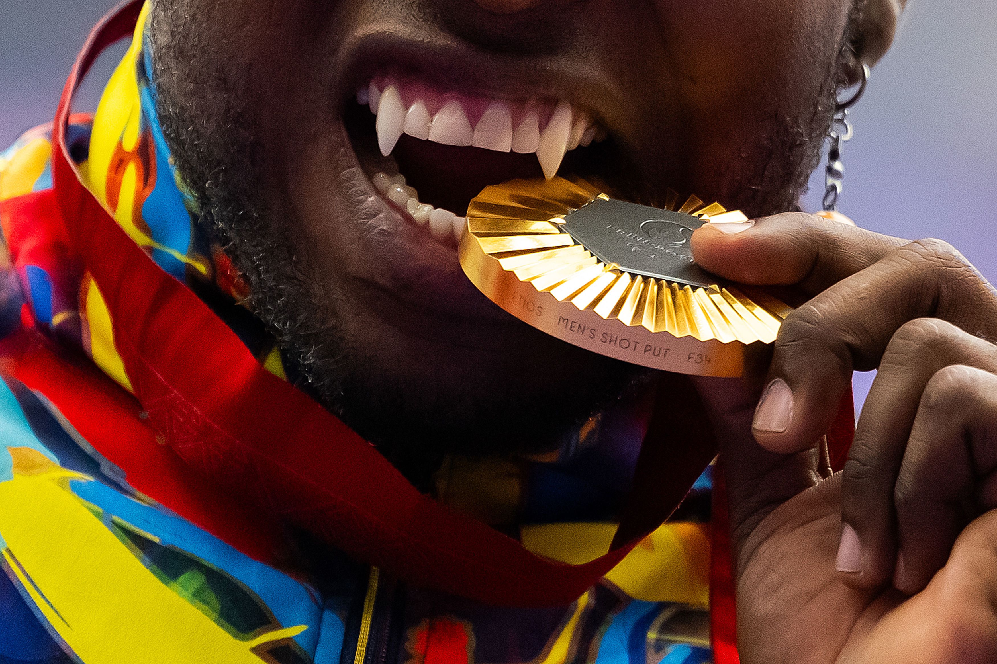 Colombian athlete Mauricio Valencia sinks his teeth into his gold medal after winning a shot put event at the Paris Paralympics on Saturday, September 7, 2024. Valencia had his teeth modified to mimic fangs, he said, in at attempt to change the stigma toward Paralympic athletes. “I didn't want to have the same smile as the rest of the world”, Valencia said in 2019. “I've always said that Paralympic sport has to be a show. That means being outside of the stereotype of sitting in a wheelchair. It's a matter of attitude in life, and while I am competing”. (Photo by David Ramos/Getty Images)