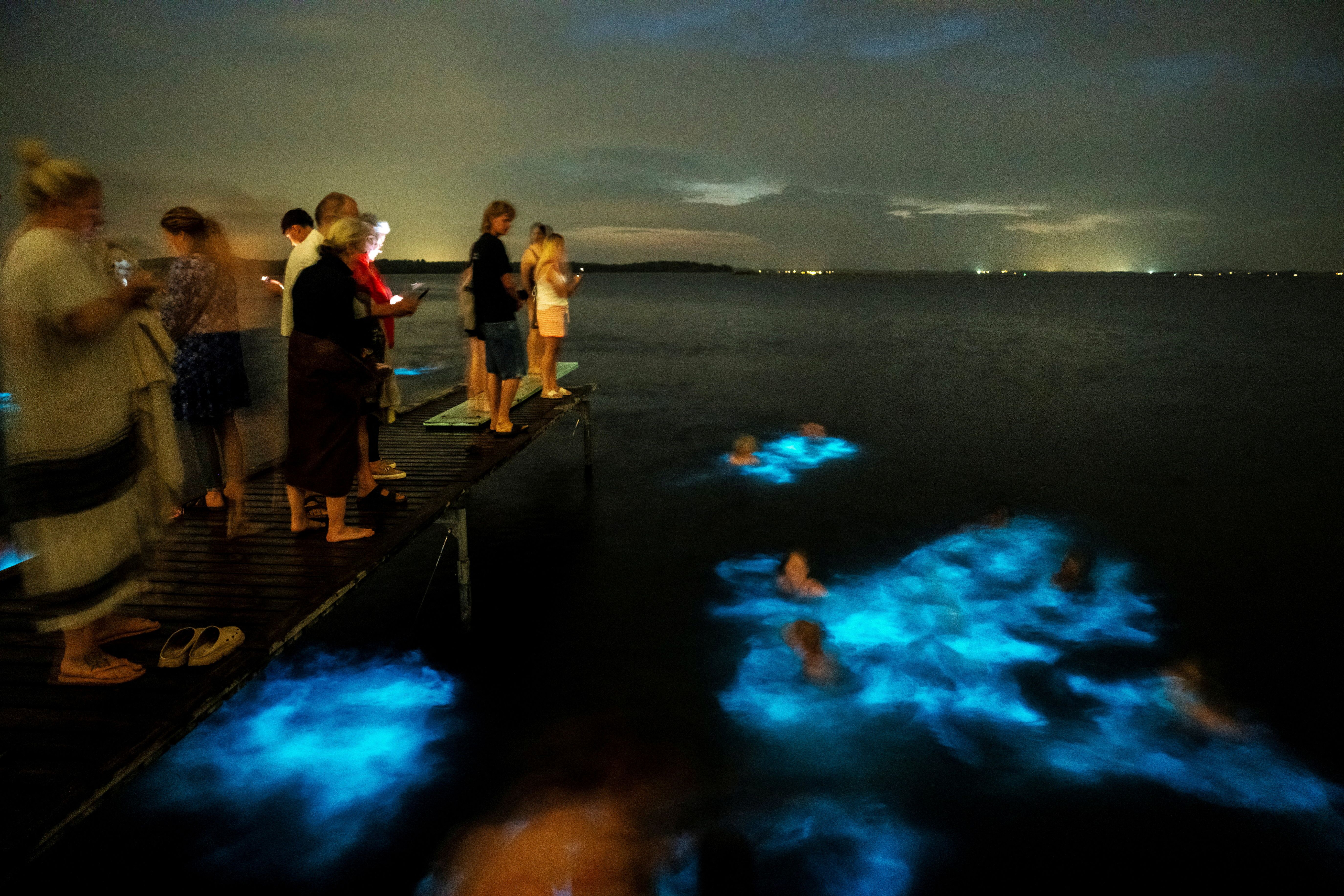 People gather at Veddelev beach in Roskilde Fjord, Denmark, to experience the natural phenomenon of bioluminescence, on Sunday September 8, 2024. (Photo by Ritzau Scanpix via Reuters)