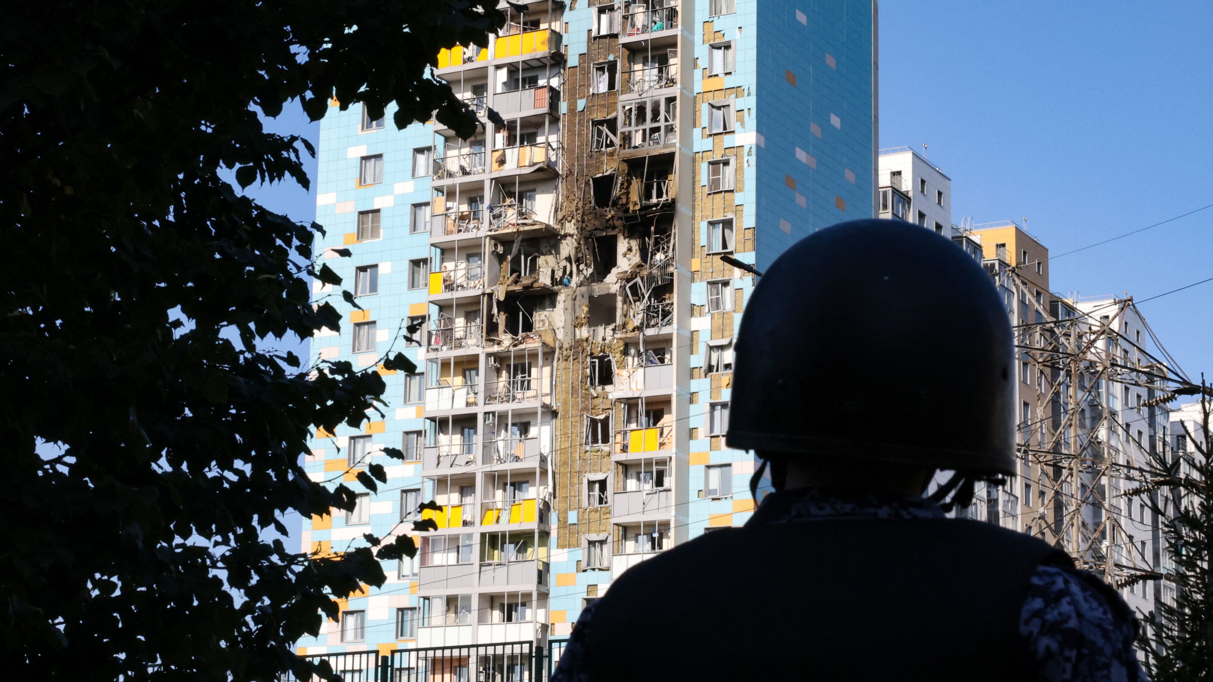 This photo shows a damaged residential building following a drone attack in Ramenskoye in the Moscow region on September 10, 2024. A massive wave of Ukrainian drones set off air defences across several Russian regions, officials said on September 10, 2024, killing at least one person and grounding flights in the capital. (Photo by Tatyana Makeyeva/AFP Photo)