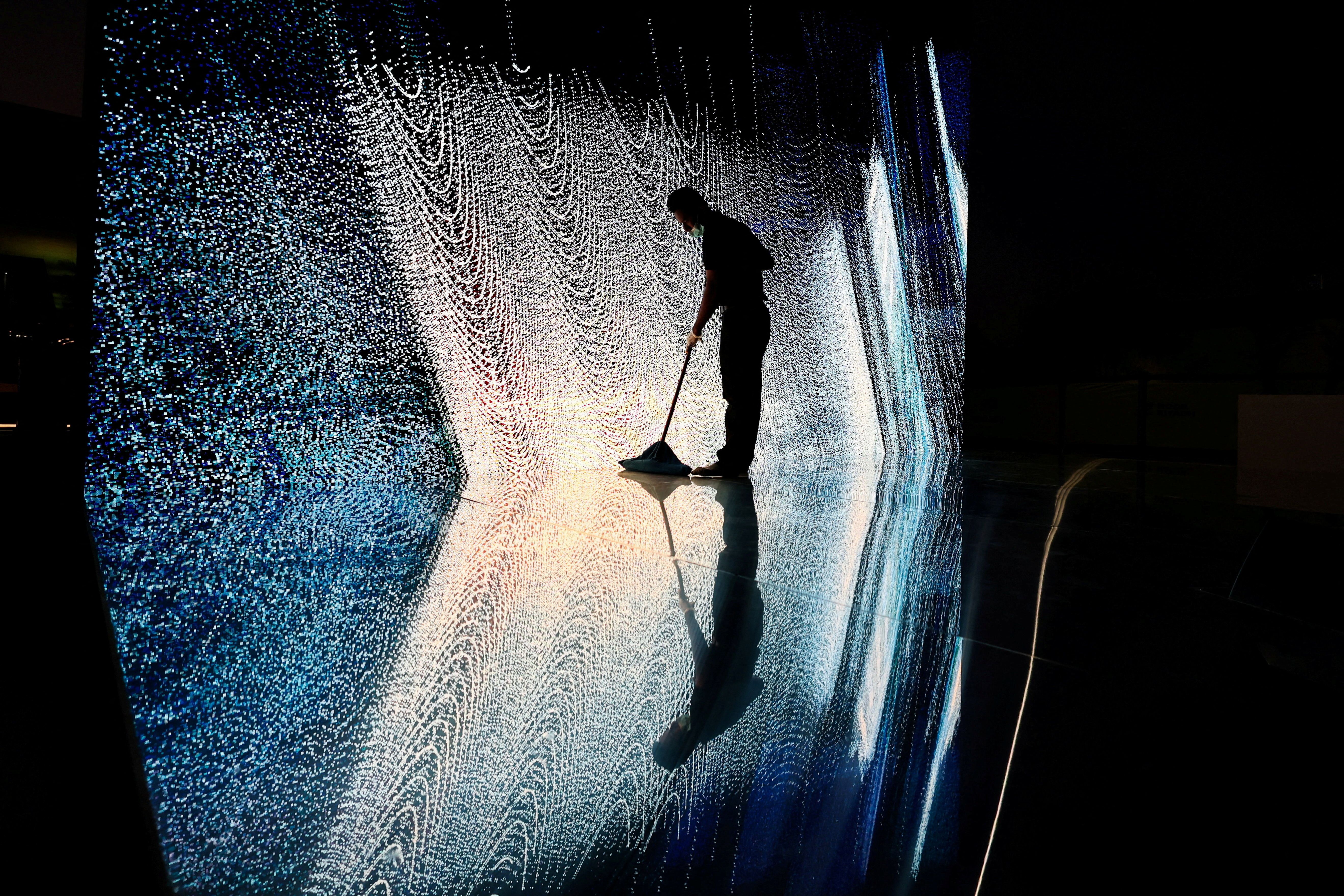 A worker cleans the floor near an art work ahead of the inauguration ceremony of the light festival “Noor Riyadh”, under the theme "In the Blink of an Eye", in Riyadh, Saudi Arabia, on November 19, 2025. (Photo by Hamad I Mohammed/Reuters)