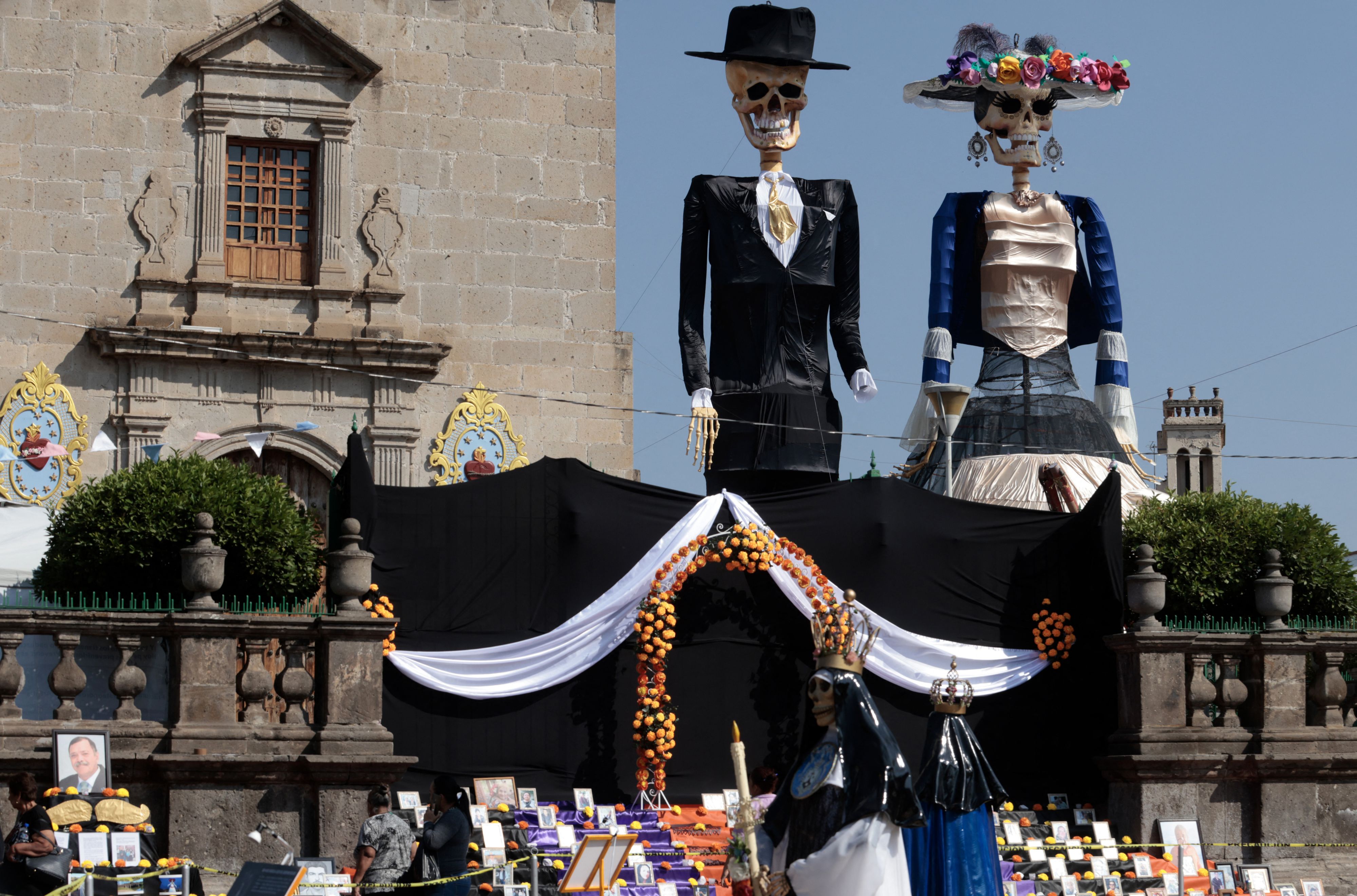 People work on the installation of the 22-meter high “Monumental Catrinas” family, in the main square of Zapotlanejo, state of Jalisco, Mexico, on October 30, 2024. (Photo by Ulises Ruiz/AFP Photo)