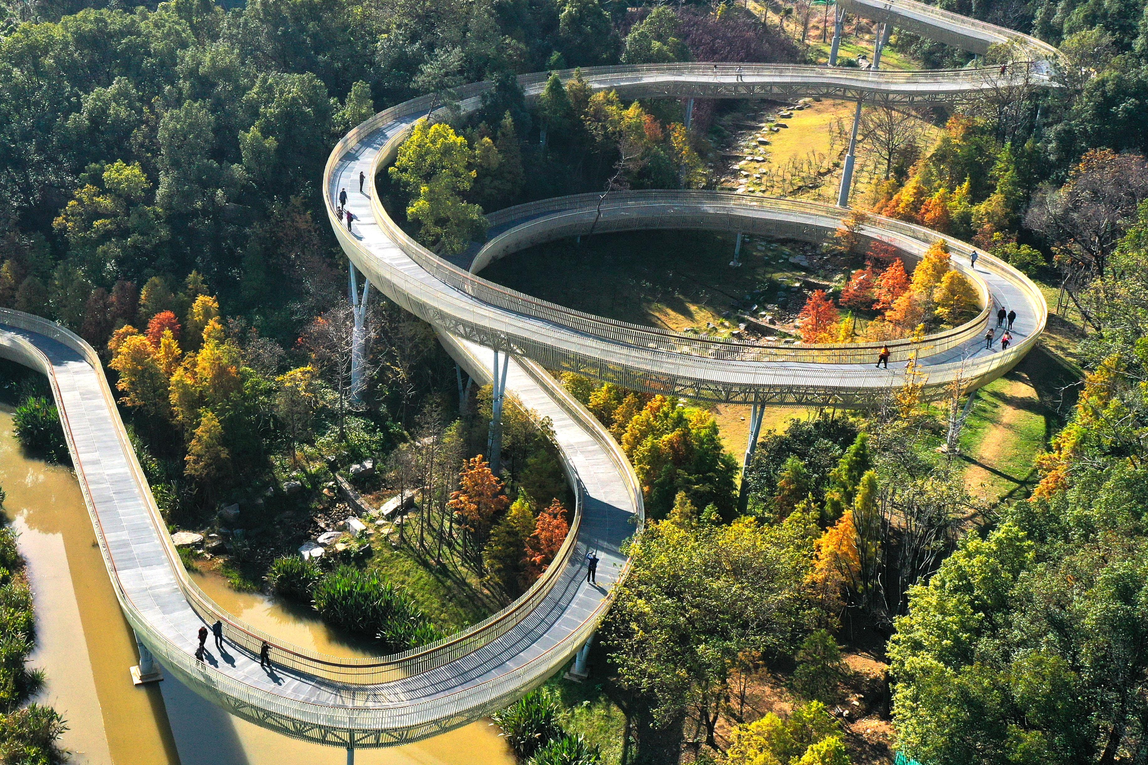 Aerial view of tourists walking on a footpath at Mopan Mountain Forest Park on November 26, 2021 in Nanchang, Jiangxi Province of China. (Photo by Liu Zhankun/China News Service via Getty Images)