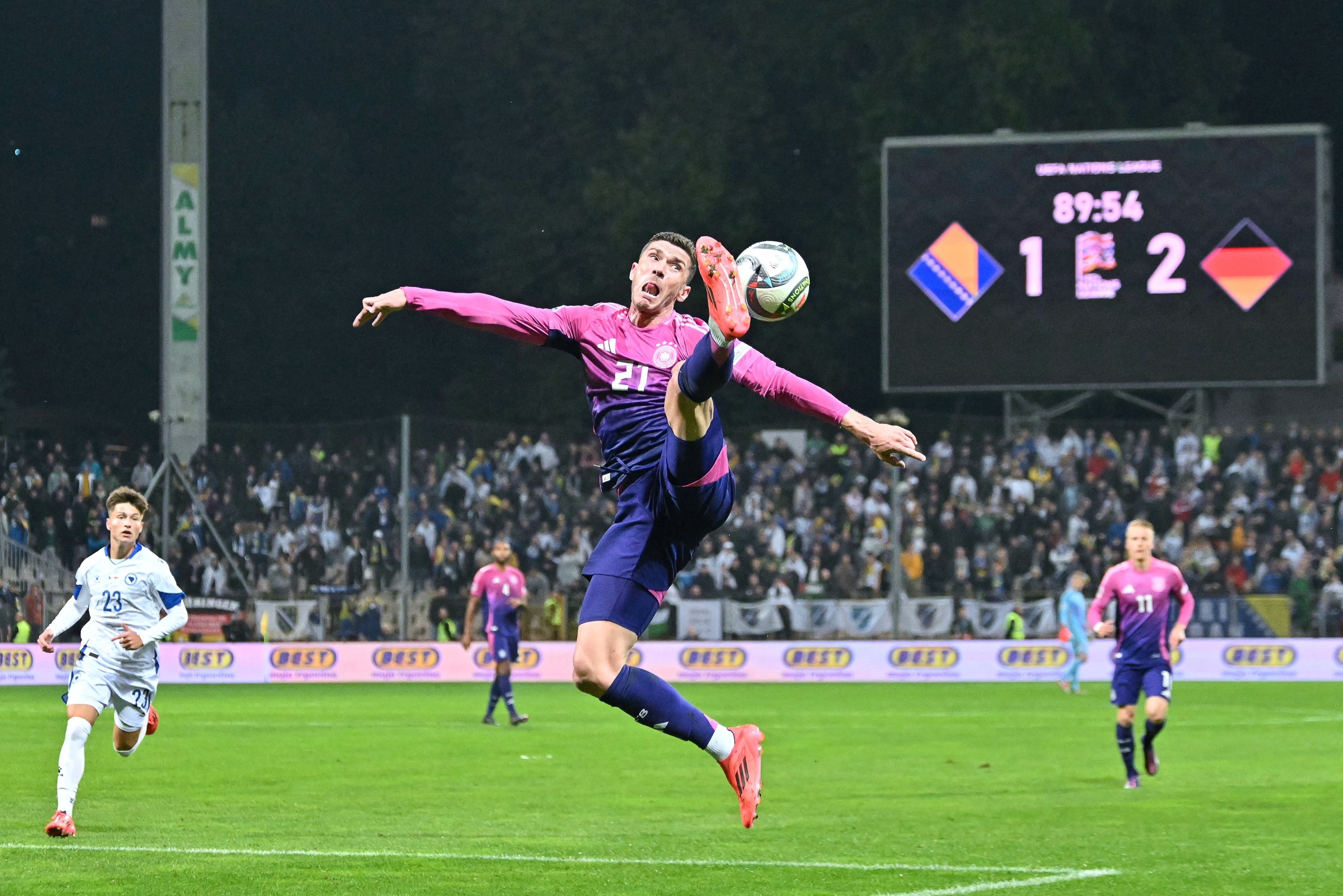 Germany's defender #21 Robin Gosens jumps to control the ball during the UEFA Nations League, League A - Group 3, football match between Bosnia and Herzegovina and Germany at the Bilino Polje Stadium in Zenica, on October 11, 2024. (Photo by Elvis Barukcic/AFP Photo)