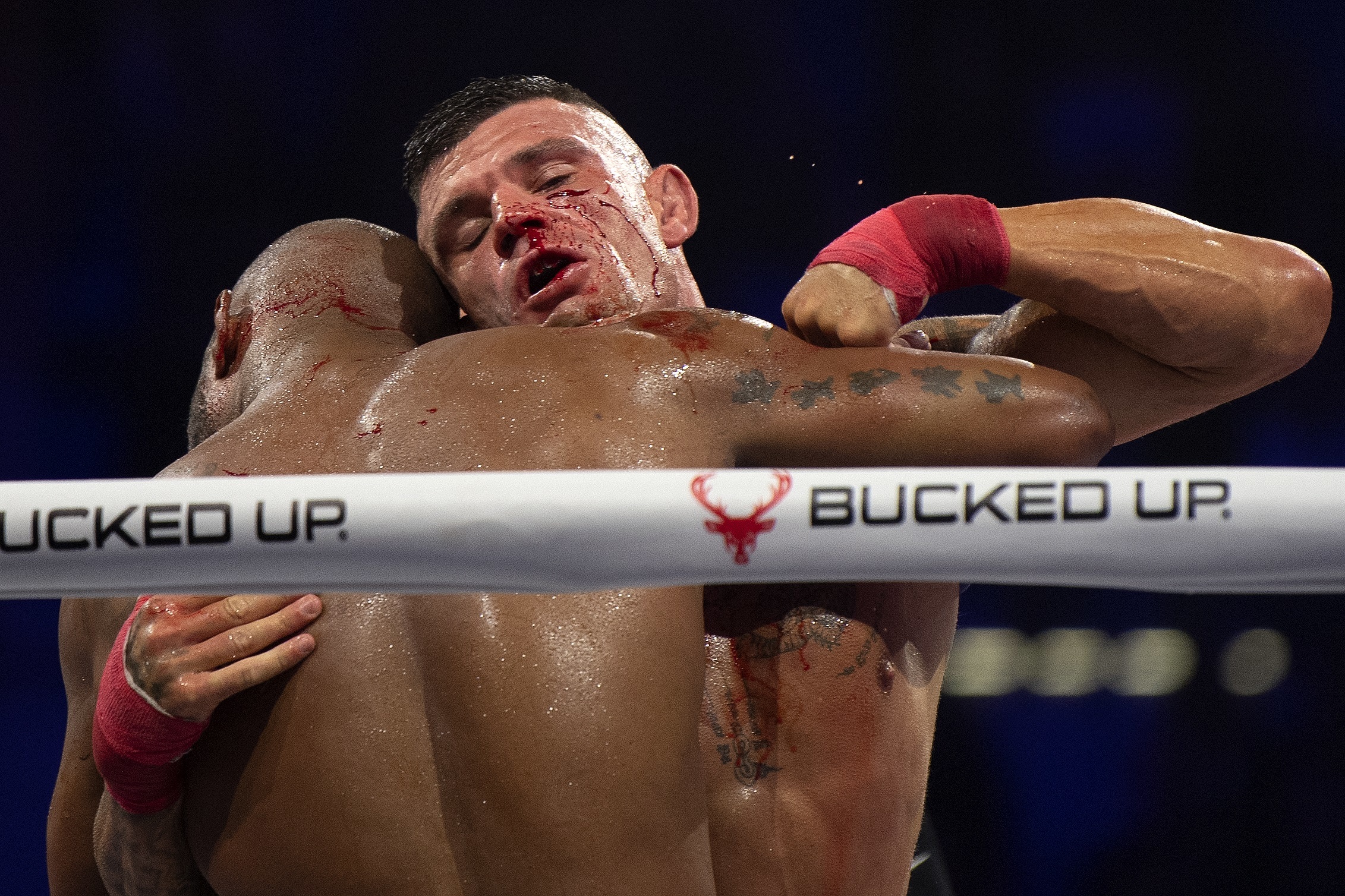 US boxer Austin Trout (L) and British boxer Rico Franco fight during the Bare Knuckle Fighting Championship (BKFC) in Marbella on October 12, 2024. (Photo by Jorge Guerrero/AFP Photo)