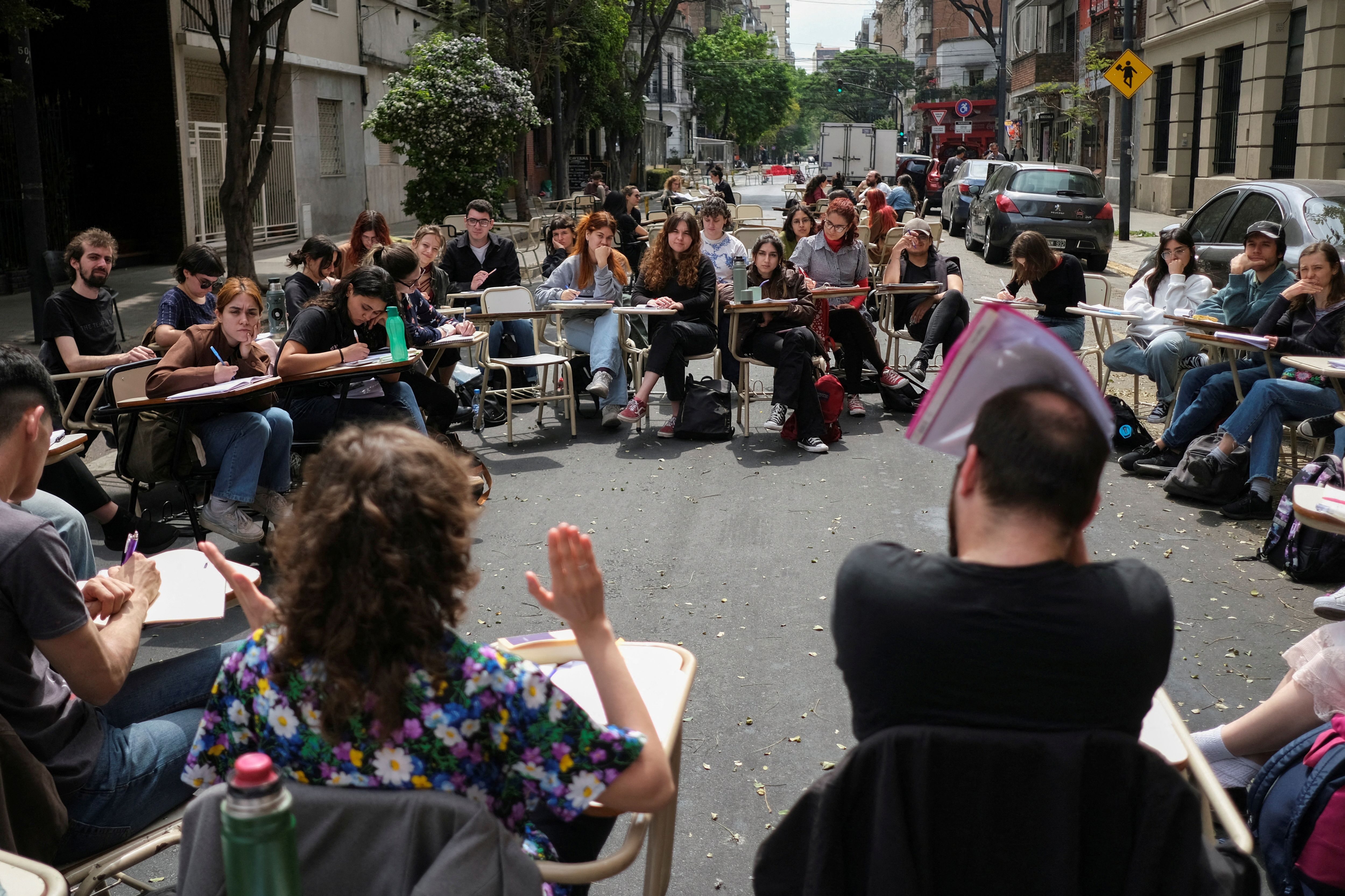 Students from the department of Philosophy and Letters at the University of Buenos Aires hold classes in the street to protest President Javier Milei's veto of a university funding law, in Buenos Aires, Argentina on October 8, 2024. (Photo by Alessia Maccioni/Reuters)