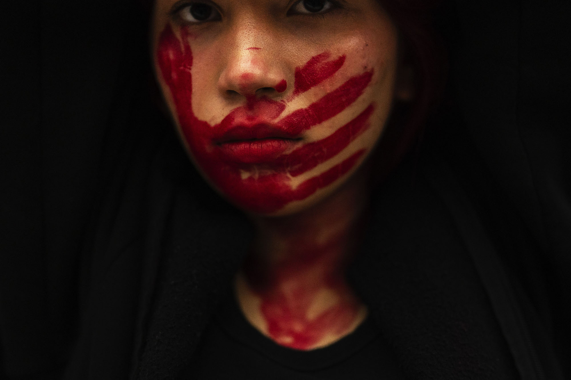 A woman with a painted face attends a protest against violence against women in Istanbul, Turkey, Saturday, October 12, 2024. (Photo by Francisco Seco/AP Photo)