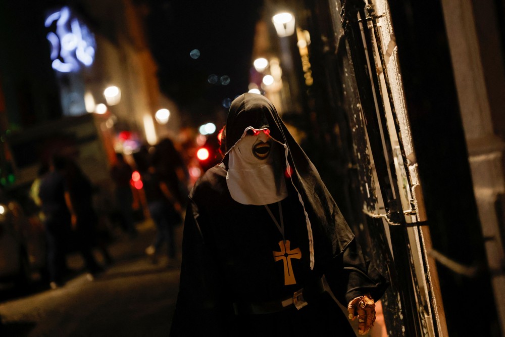 A person walks down a street dressed as the horror movie character The Nun on Halloween evening, in Monterrey Mexico on October 31, 2024. (Photo by Daniel Becerril/Reuters)
