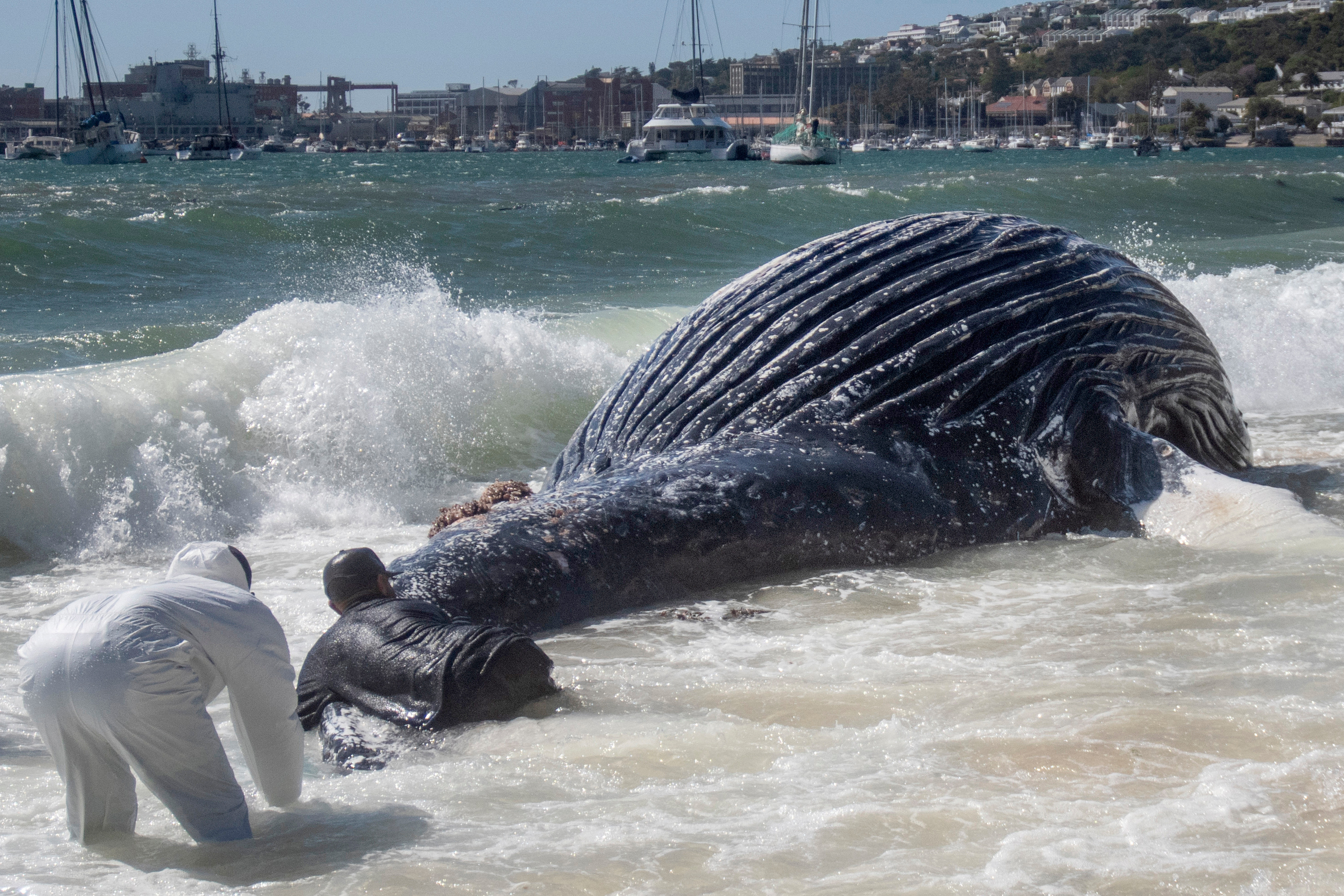 A dead humpback whale lays washed up on a beach in Simon's town in Cape Town, South Africa, Tuesday, October 15, 2024. (Photo by AP Photo/Stringer)