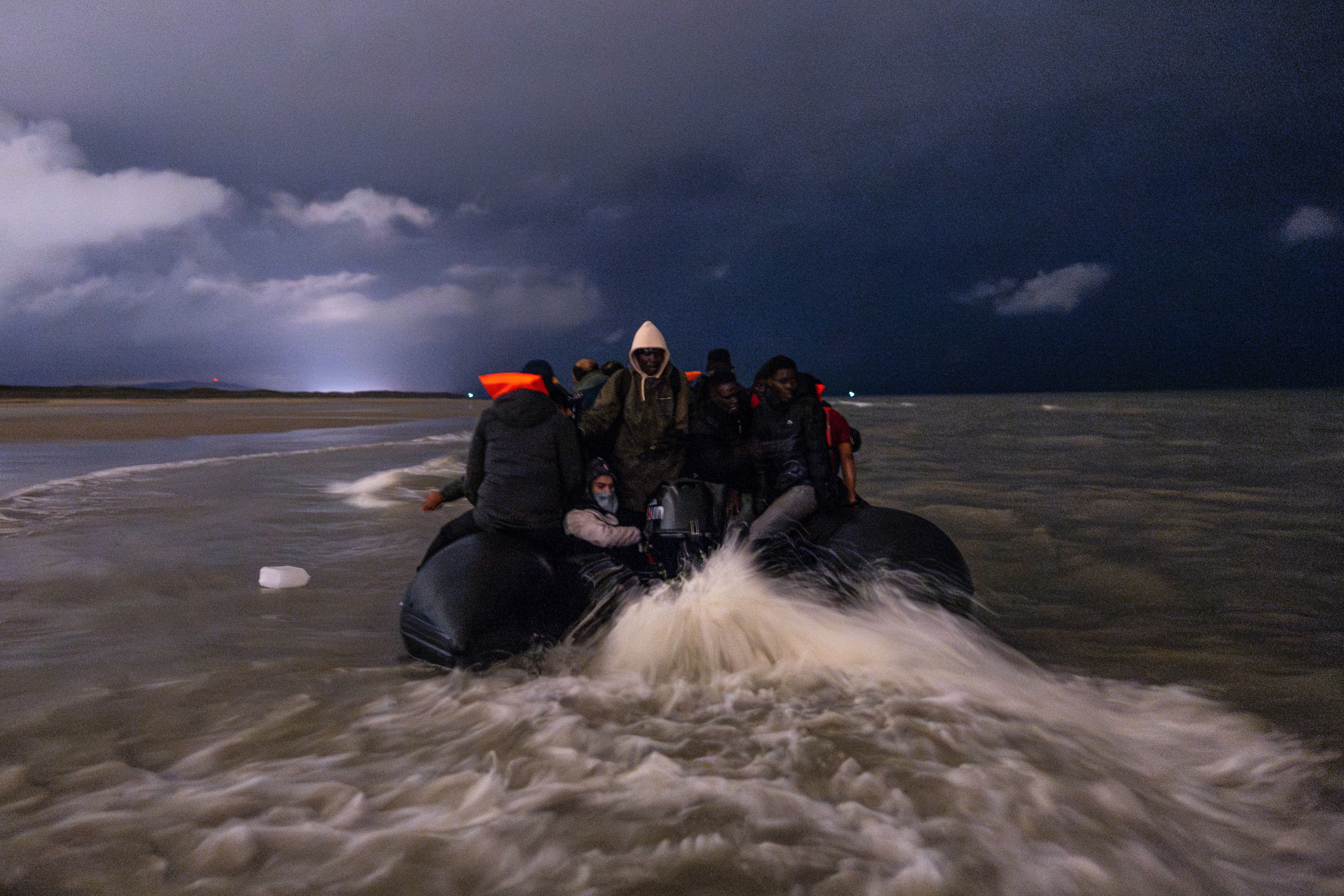 Migrants board a smuggler's inflatable dinghy in an attempt to cross the English Channel, on Bleriot beach in Sangatte, near Calais, northern France on October 30, 2024. A migrant died on October 30, 2024, attempting to cross the English Channel bringing to 57 the number of deaths this year linked to crossings in overcrowded dinghies. With British and French authorities seeking to crack down on people smuggling gangs, activists say traffickers are now herding larger groups of migrants into increasingly overcrowded and unsafe boats trying to take advantage of favourable weather conditions just a few weeks before winter. (Photo by Sameer Al-Doumy/AFP Photo)