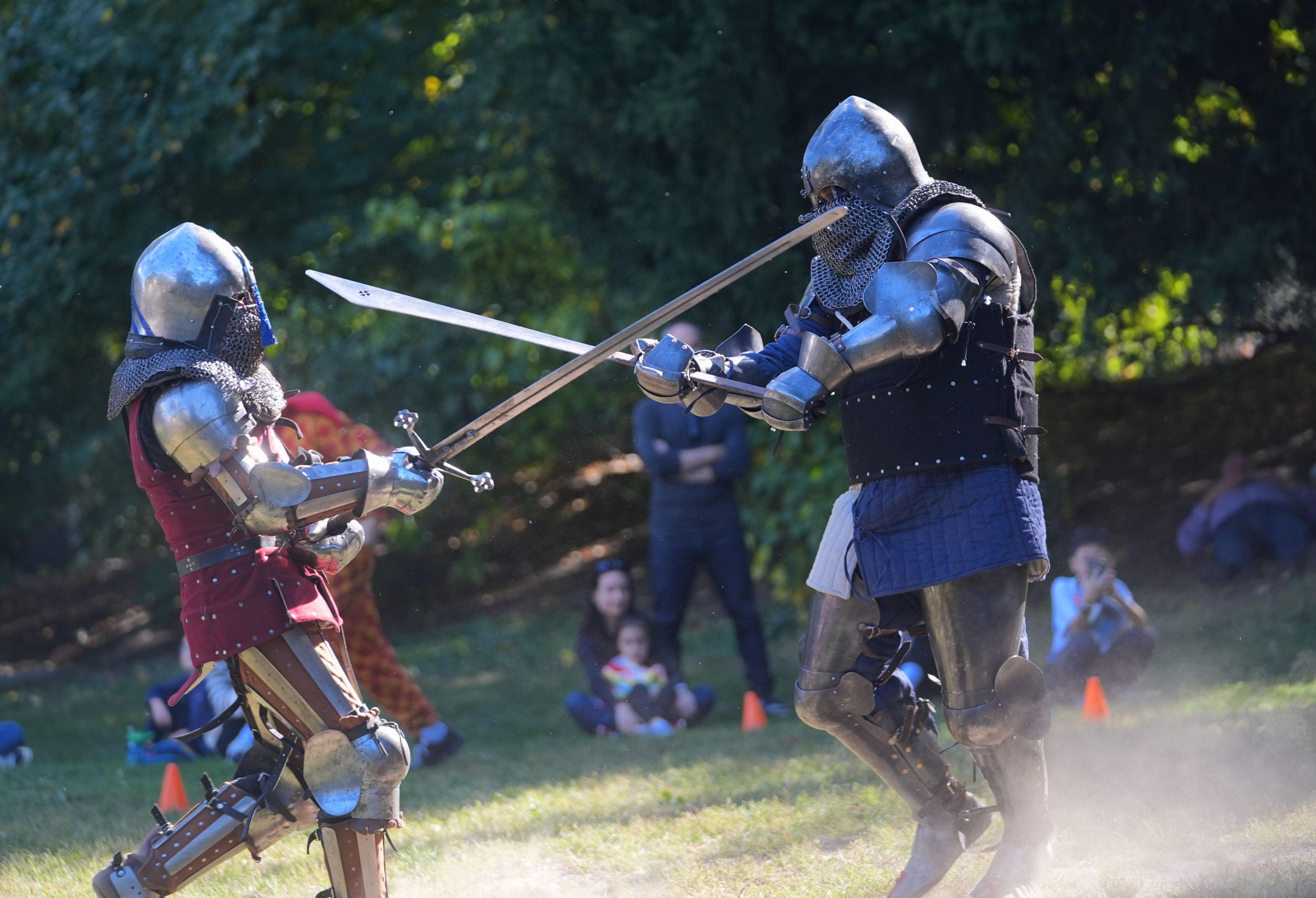Central Park hosts, New York City's premiere medieval event, the gladiators fight on Saturday, October 12, 2024. The park becomes an impromptu battlefield where combatants of Gladiators NYC are in full medieval armor. (Photo by Selcuk Acar/Anadolu via Getty Images)
