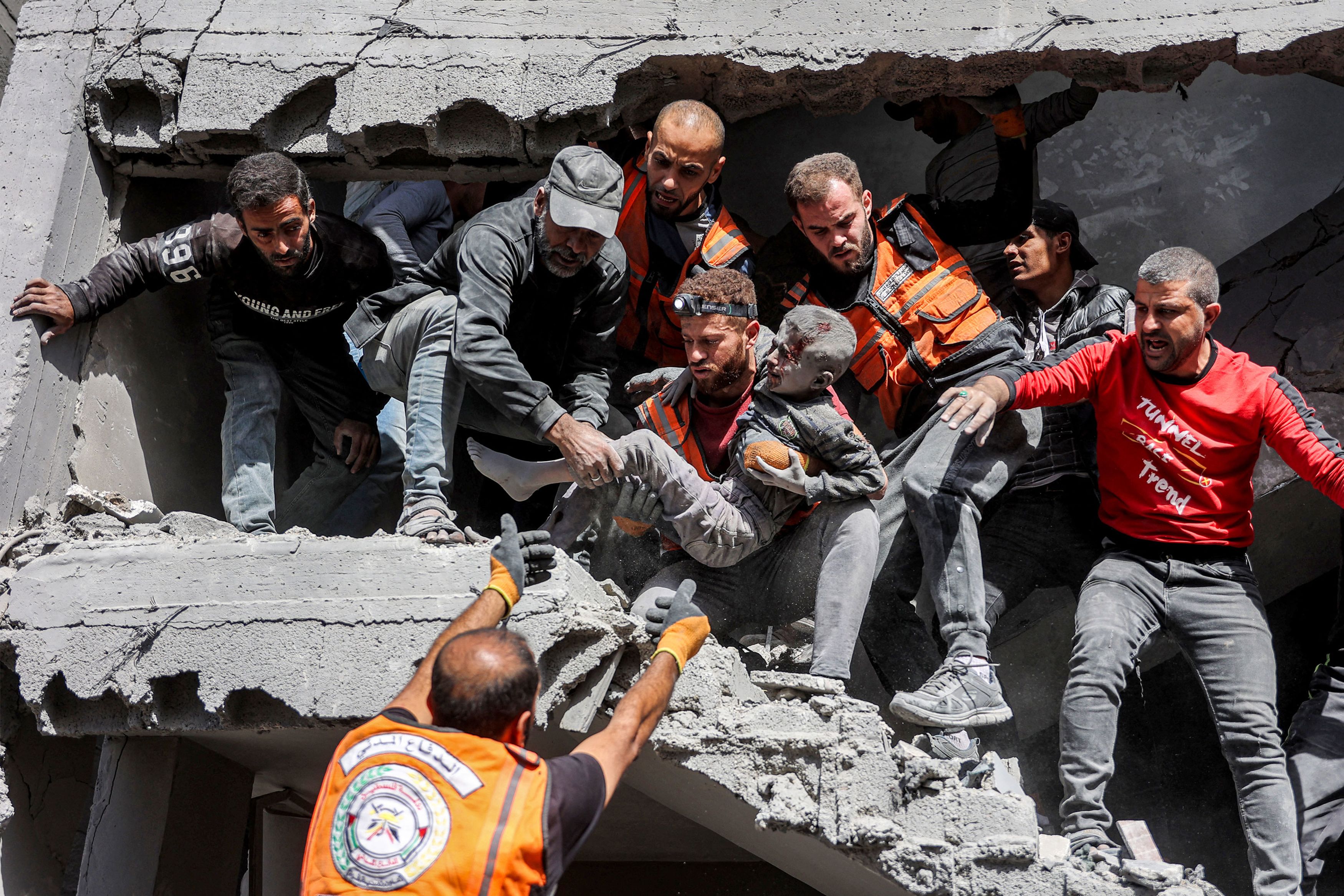 Palestinian civil defence members hand over to each other a child that was rescued following Israeli bombardment on the four-storey Muqat family house in the Zarqa neighbourhood in the north of Gaza City on October 26, 2024 amid the ongoing war in the Palestinian territory between Israel and Hamas. (Photo by Omar Al-Qattaa/AFP Photo)