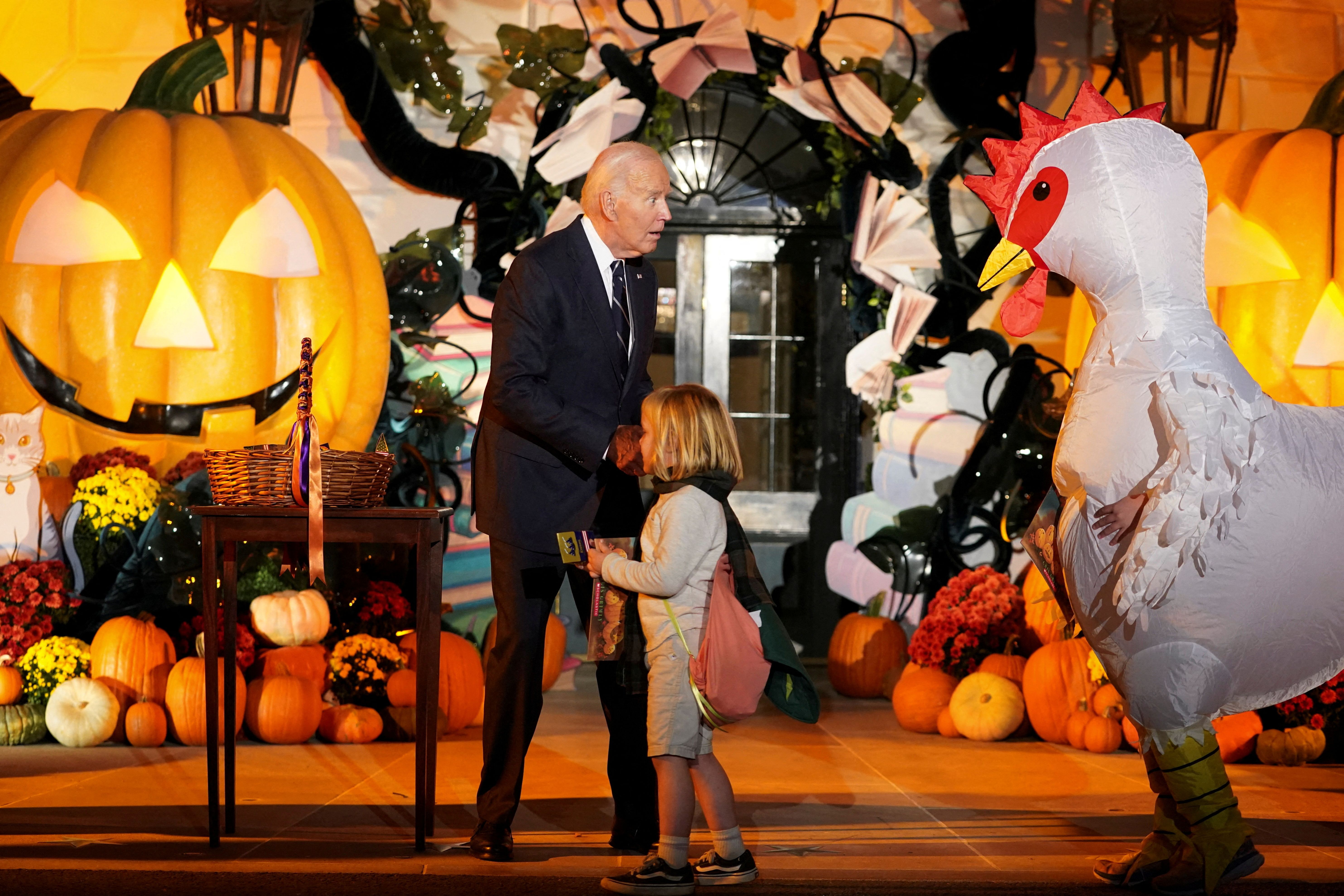 President Joe Biden looks at a person in a chicken costume during a trick-or-treaters celebration for Halloween at the White House in Washington on October 30, 2024. (Photo by Nathan Howard/Reuters)