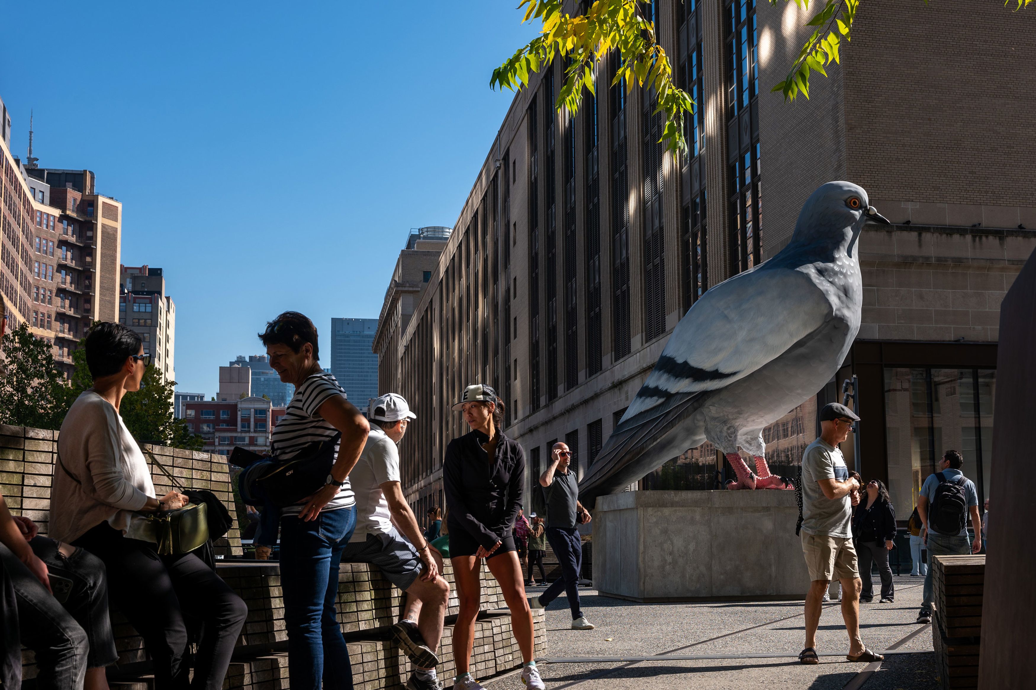 People admire “Dinosaur”, a pigeon sculpture along the High Line in New York, on Monday, October 21, 2024. The hand-painted sculpture by artist Iván Argote celebrates the pigeon's distant past as the birds descended from dinosaurs. (Photo by Spencer Platt/Getty Images)