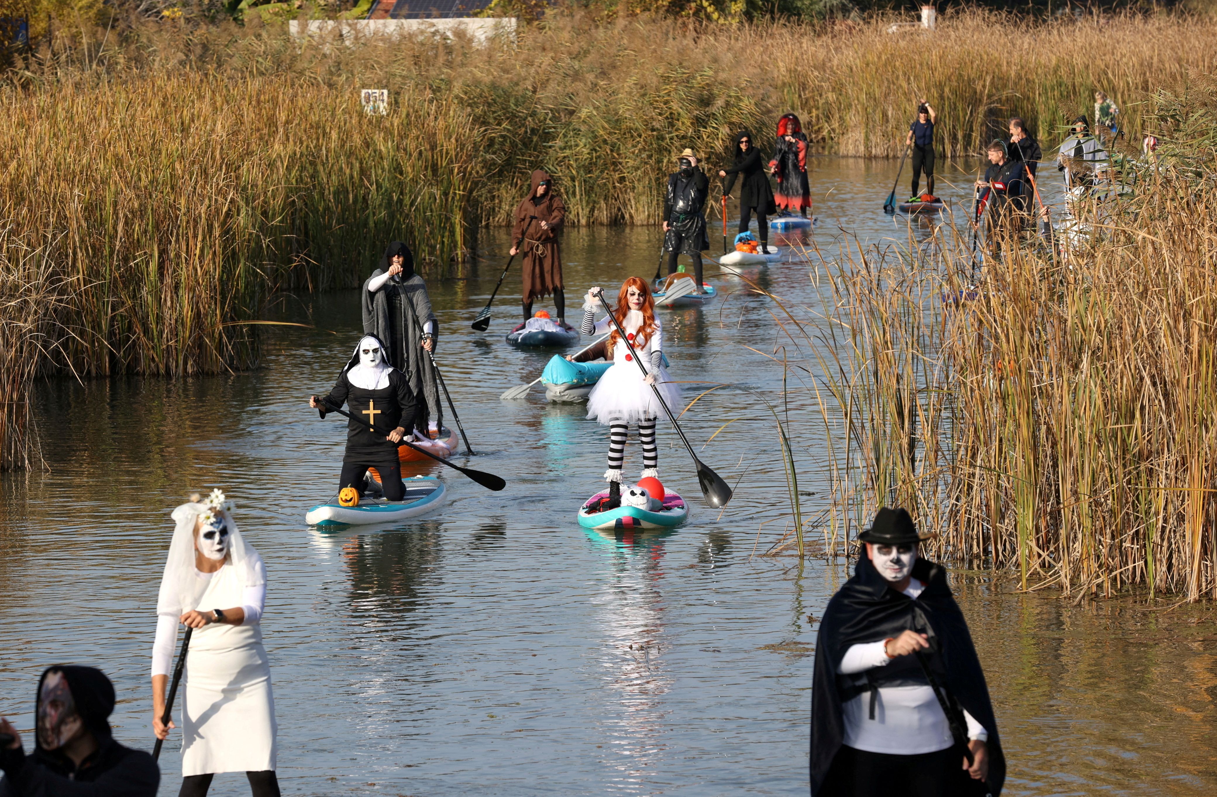 Participants make their way during a Halloween SUP tour on the Rackevei-Duna, in Szigetszentmiklos, Hungary, on October 27, 2024. (Photo by Bernadett Szabo/Reuters)