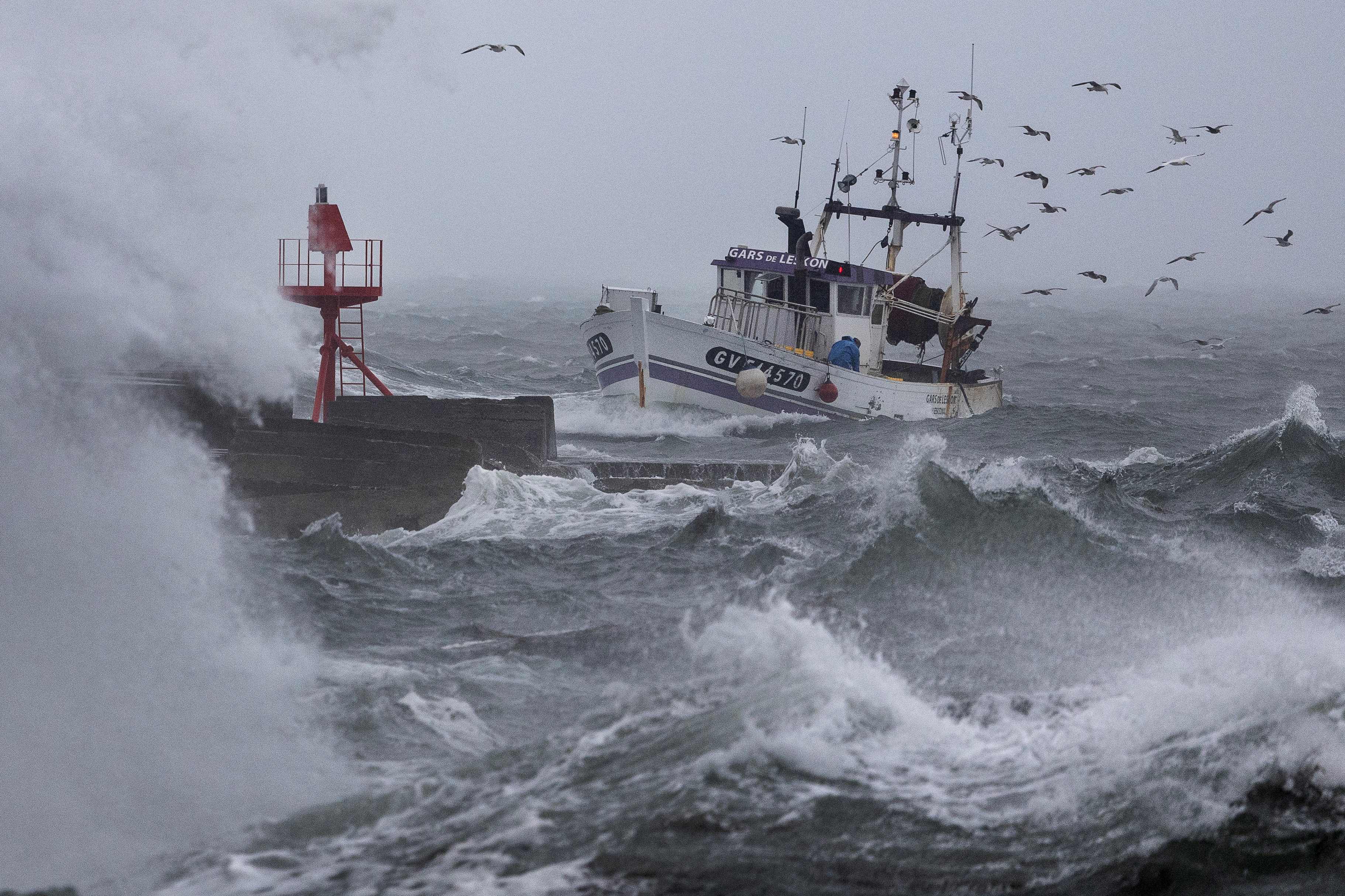 A fishing boat arrives at the port in Plobannalec-Lesconil, western France, October 22, 2025, as huge waves and strong winds hit the coast at the passage of the storm Benjamin. (Photo by Fred Tanneau/AFP Photo)