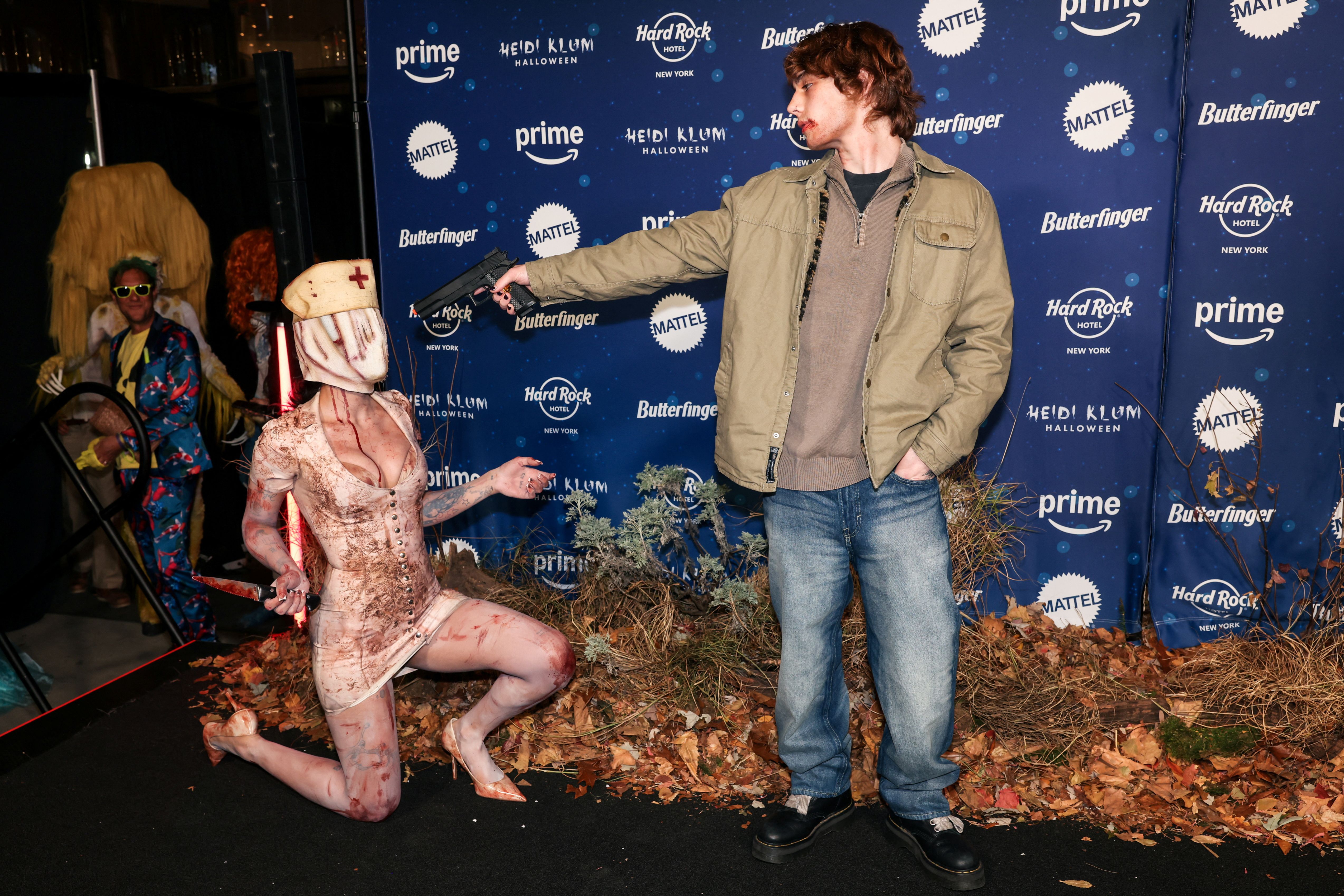 YouTuber Noor Dabash and Internet personality Bryce Mckenzie pose after arriving to Heidi Klum's 23rd annual Halloween party on Thursday, October 31, 2024, at Hard Rock Hotel New York in New York. (Photo by Caitlin Ochs/Reuters)