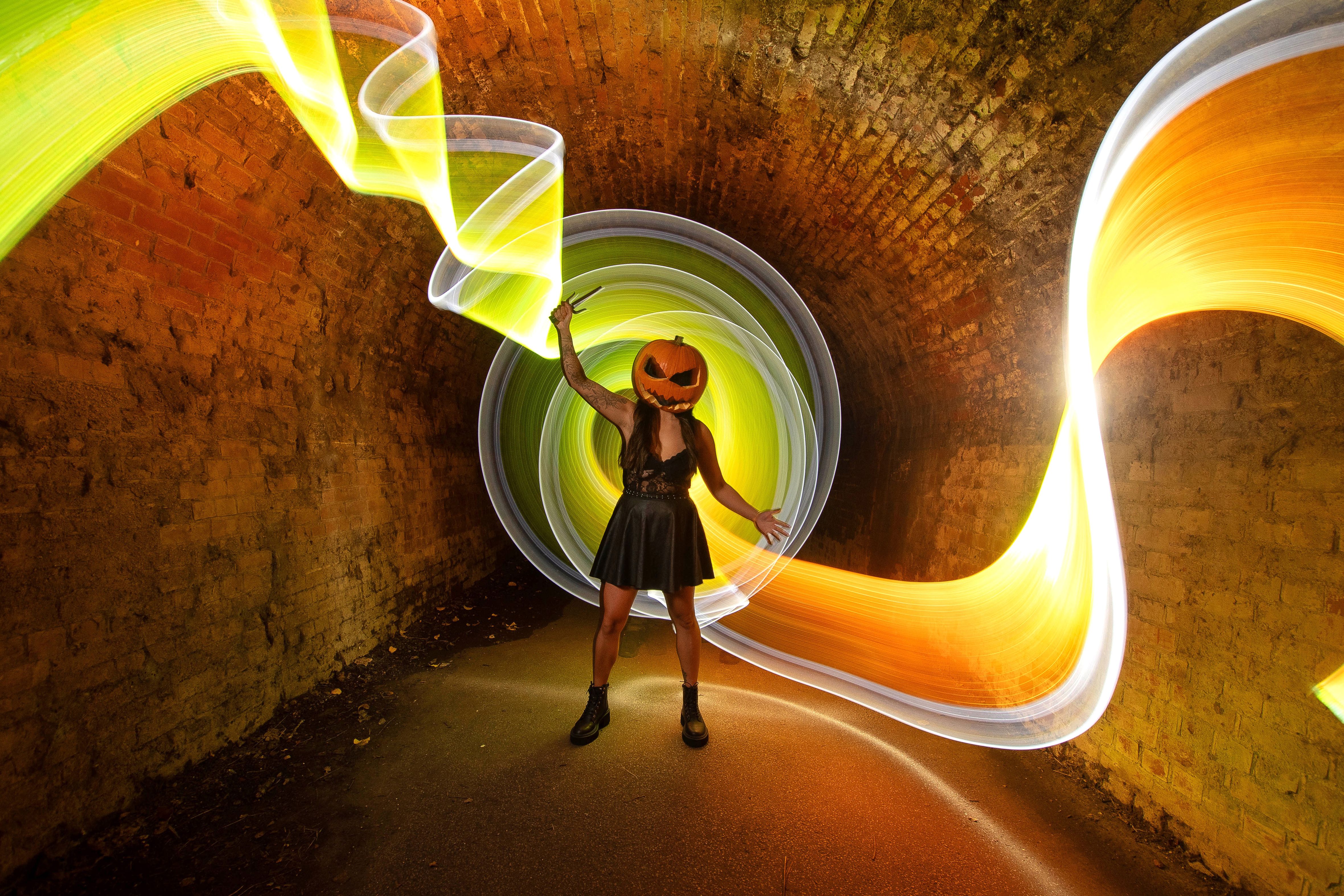 A halloween themed light painting photo featuring Jessica Astley in a Colchester tunnel in Essex, UK on October 25, 2024, using colourful LED lights moved about during a seven-second exposure. (Photo by Kevin Jay/Picture Exclusive)
