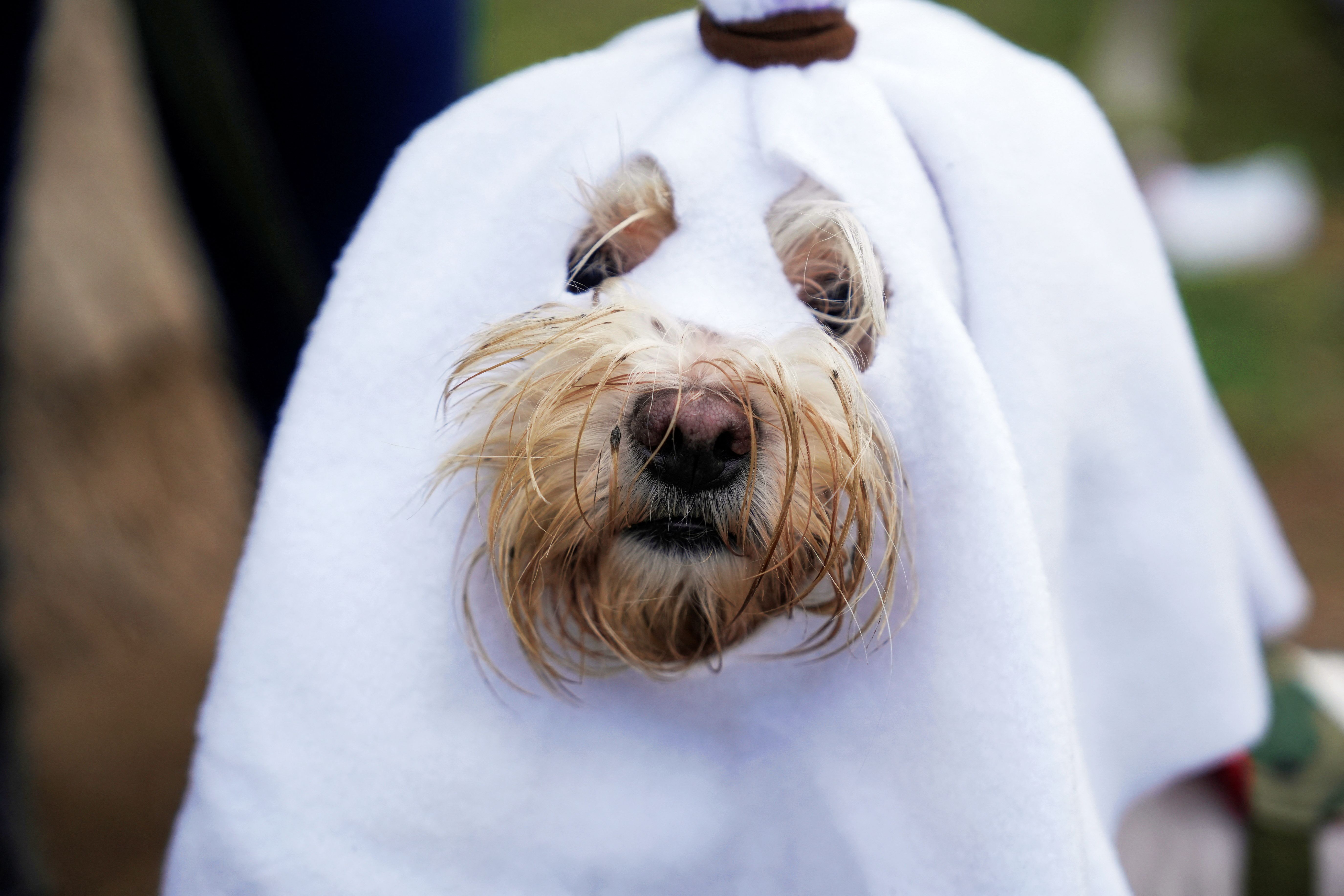 A dog dressed in a Halloween costume participates in a pet costume competition, in Lima, Peru on October 25, 2024. (Photo by Angela Ponce/Reuters)