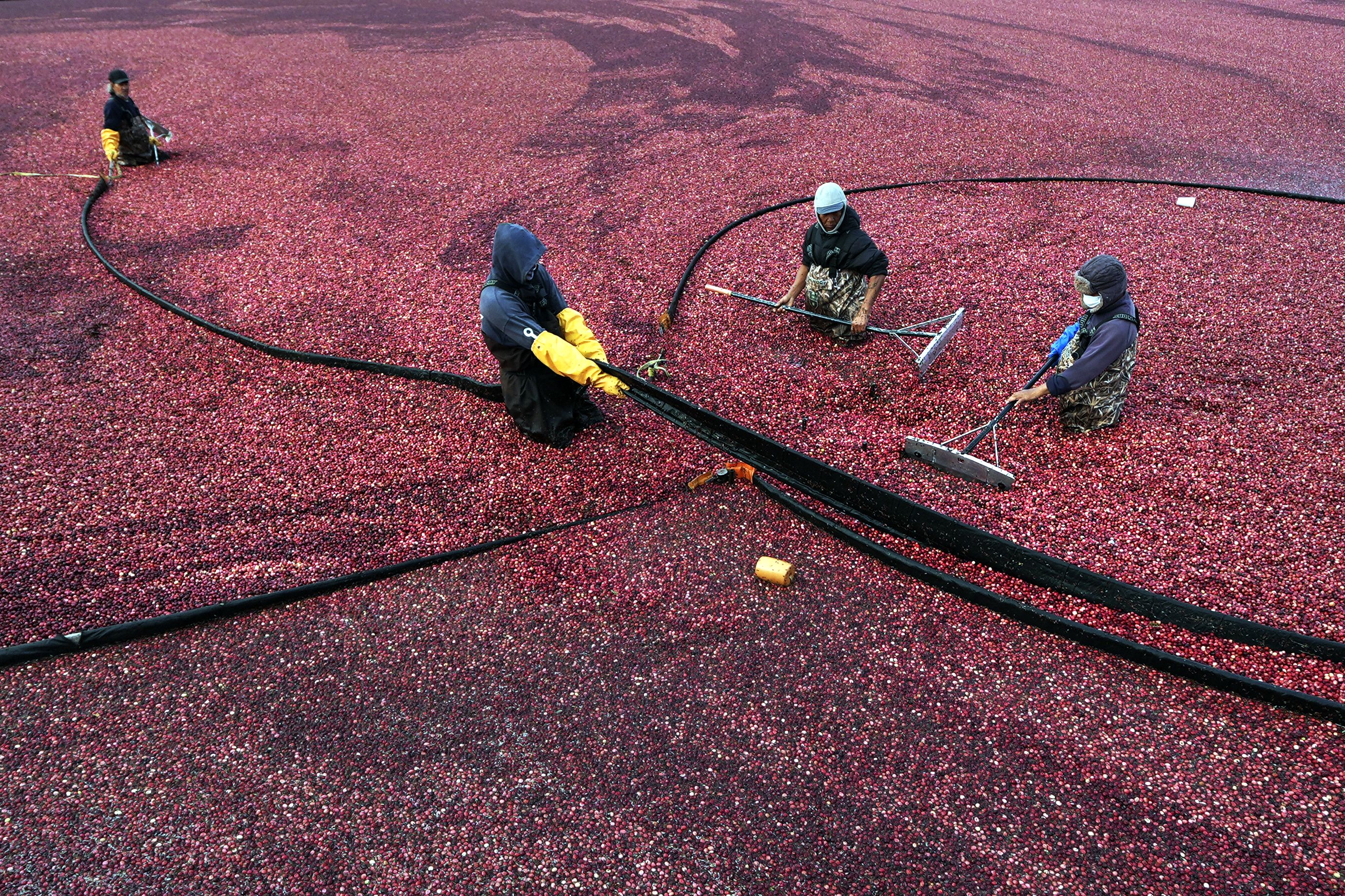 Workers adjust floating booms while wet harvesting cranberries at Rocky Meadow Bog, Friday, November 1, 2024, in Middleborough, Mass. (Photo by Charles Krupa/AP Photo)