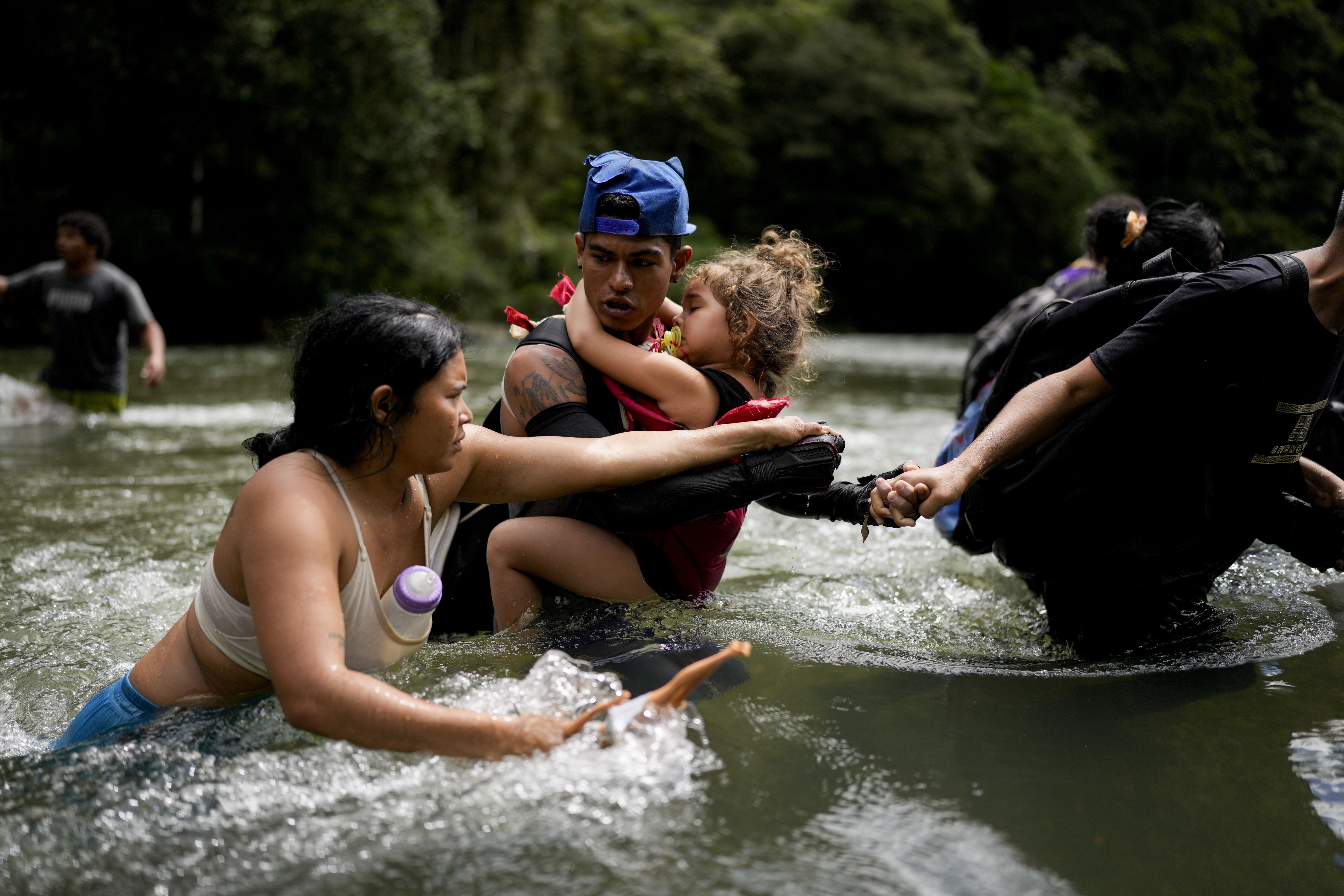 Venezuelan migrant Alvaro Calderini carries his niece across a river near Bajo Chiquito, Panama, after walking across the Darien Gap from Colombia on their way north to the United States, Saturday, November 9, 2024. (Photo by Matias Delacroix/AP Photo)