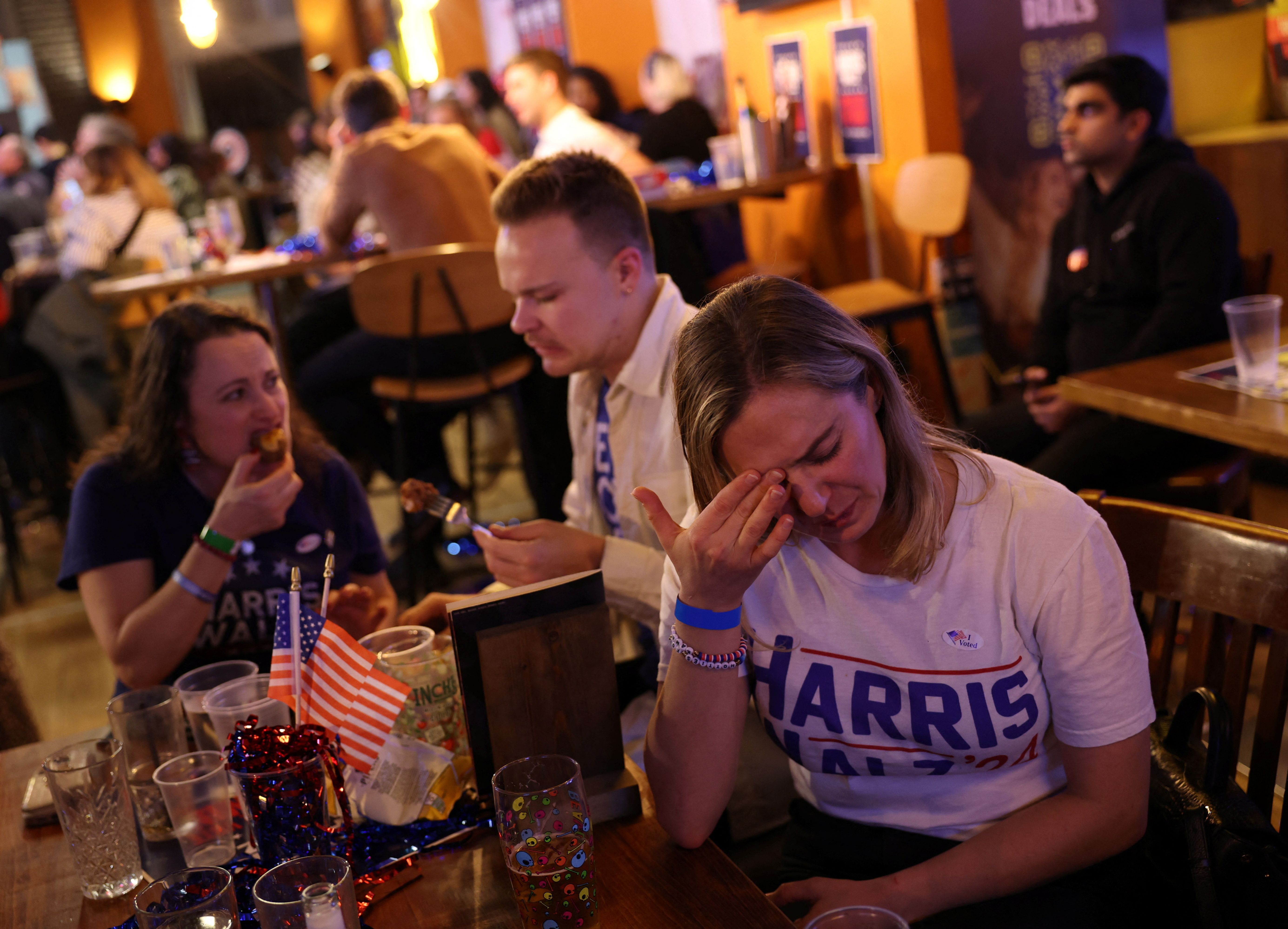 Americans react while watching election coverage at an Election Night Watch Party by Democrats Abroad UK at a pub in London, Britain on November 6, 2024. (Photo by Isabel Infantes/Reuters)