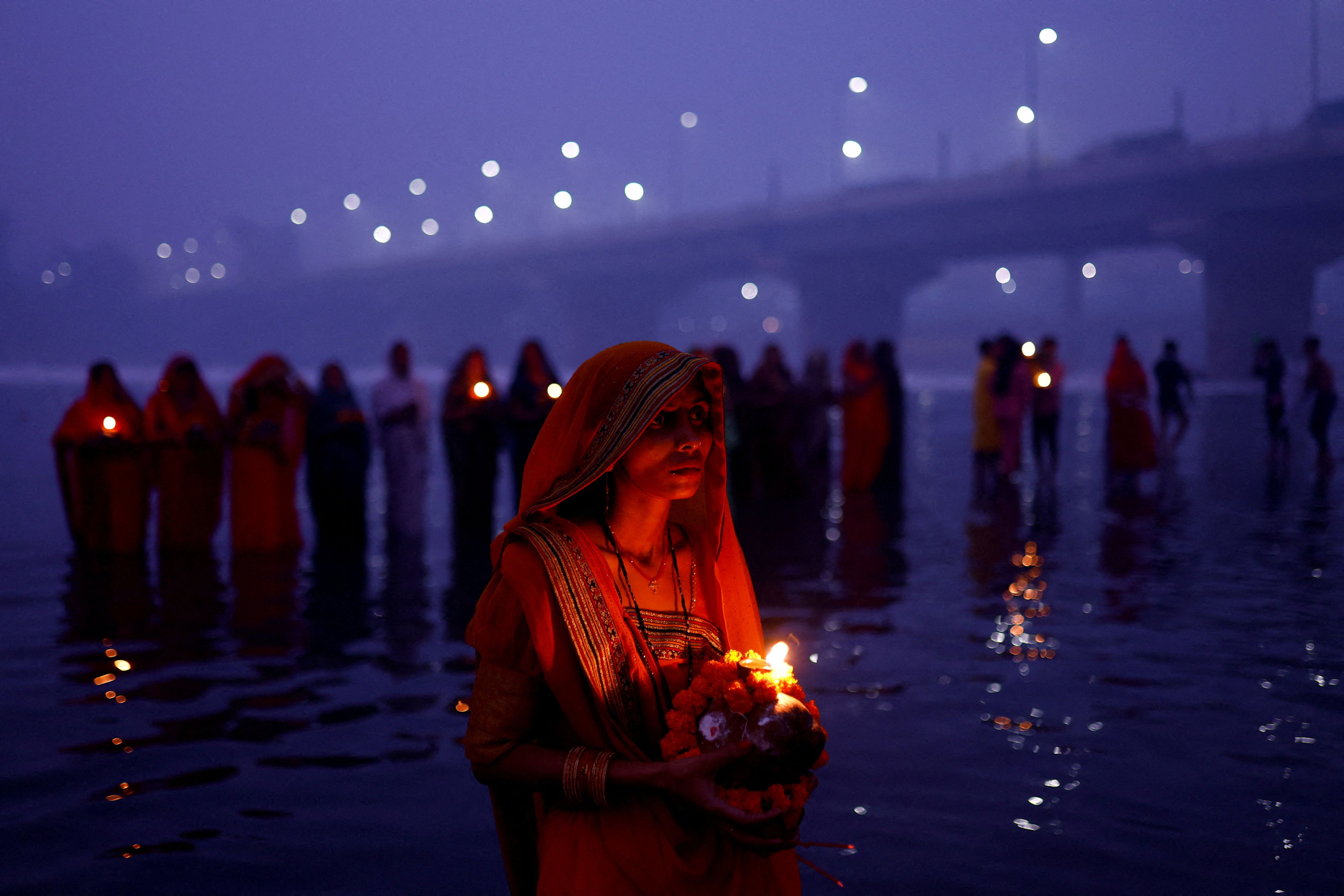 Hindu devotees worship the Sun god as they stand in the polluted waters of the river Yamuna during the Hindu religious festival of Chhath Puja on a smoggy morning in New Delhi, India, on November 8, 2024. (Photo by Anushree Fadnavis/Reuters)
