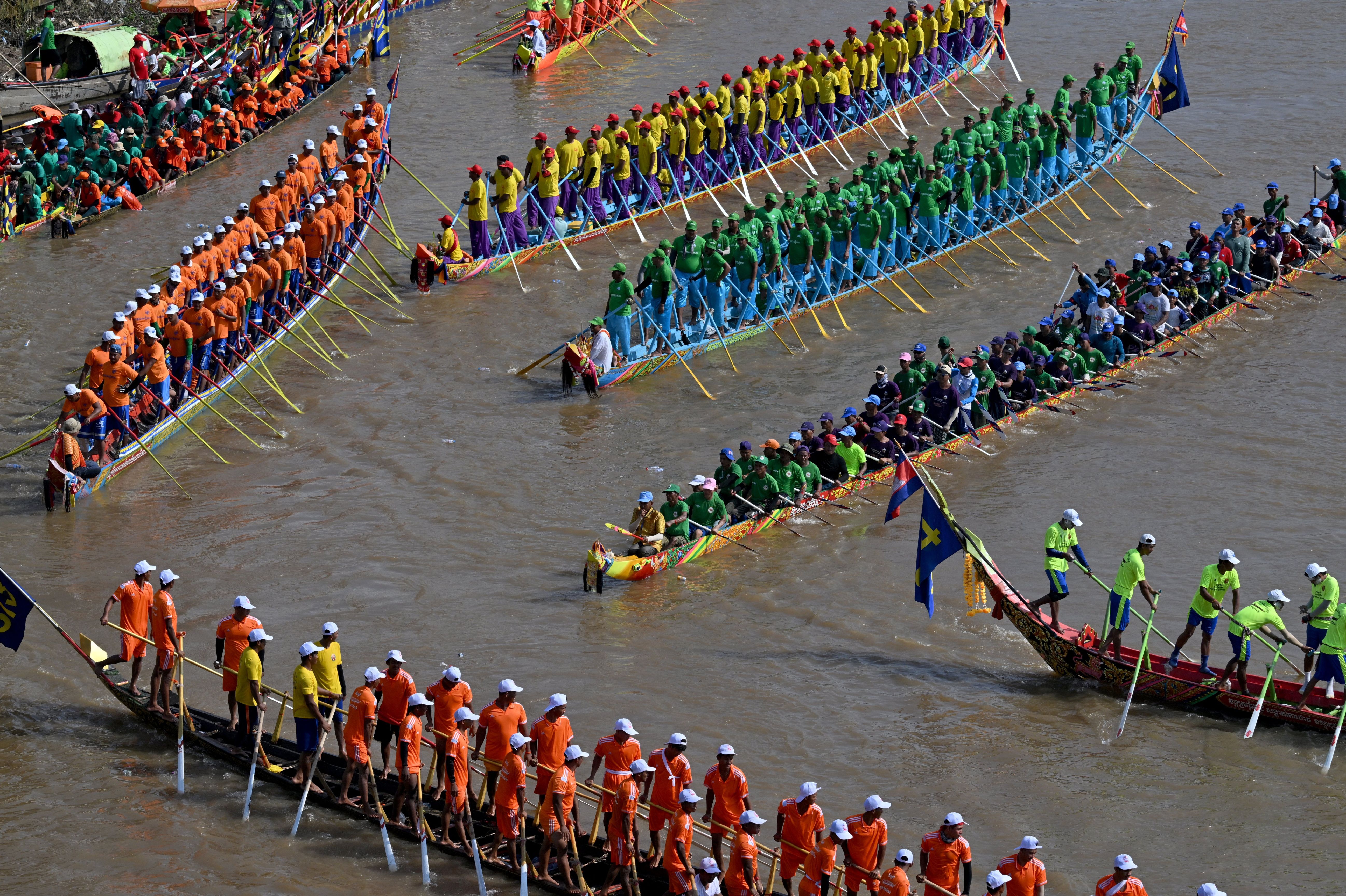 Participants row their dragon boats as they prepare to compete during the Cambodian Water Festival on the Tonle Sap river in Phnom Penh on November 14, 2024. (Photo by Tang Chhin Sothy/AFP Photo)