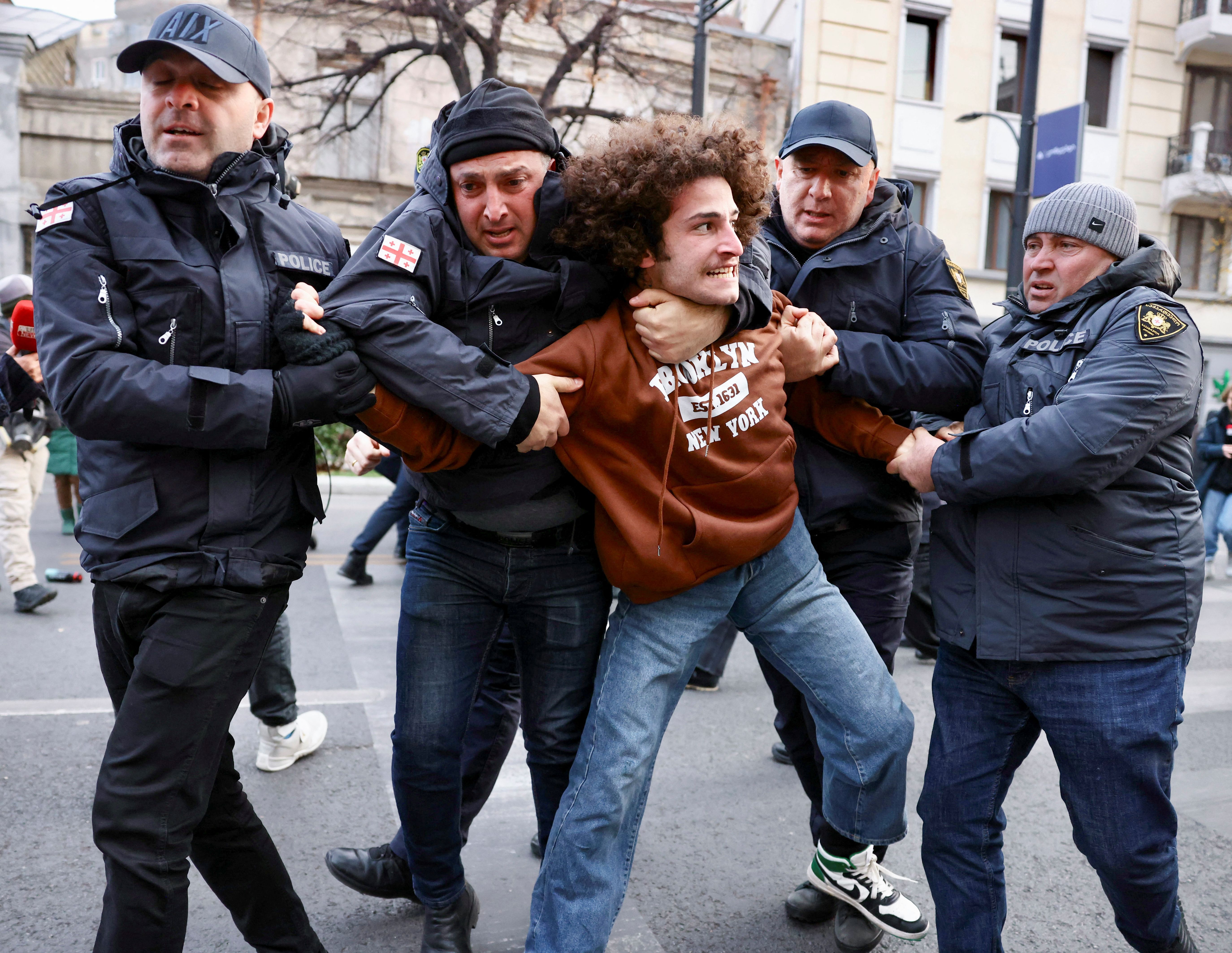 Police officers carry away an opposition protester as they make arrests during a demonstration against election results in Tbilisi, Georgia on November 19, 2024. (Photo by Guram Muradov/Reuters)
