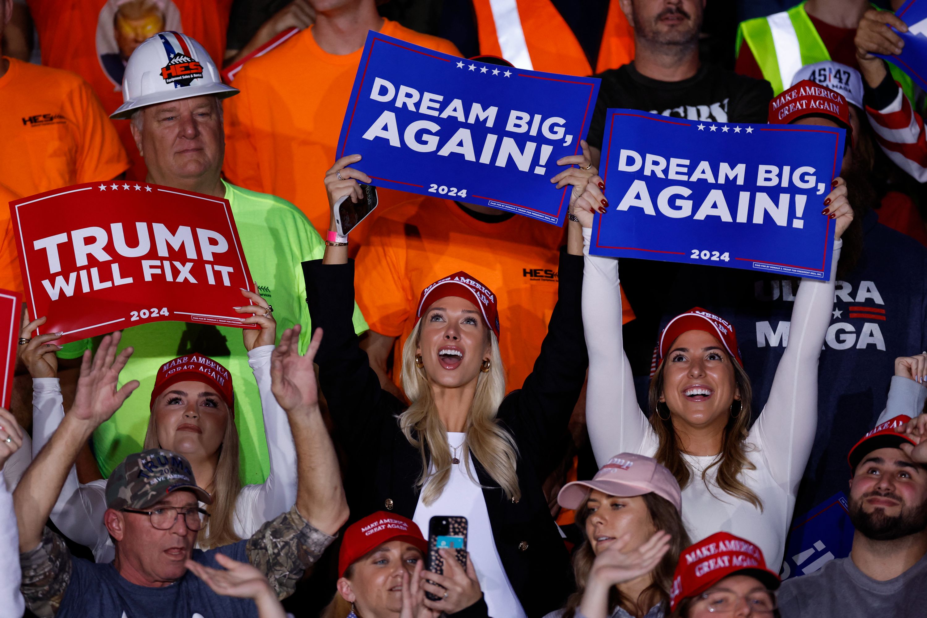 Supporters hold up signs during the final campaign rally for former US President and Republican presidential candidate Donald Trump before election day at Van Andel Arena in Grand Rapids, Michigan, on November 4, 2024. (Photo by Kamil Krzaczynski/AFP Photo)