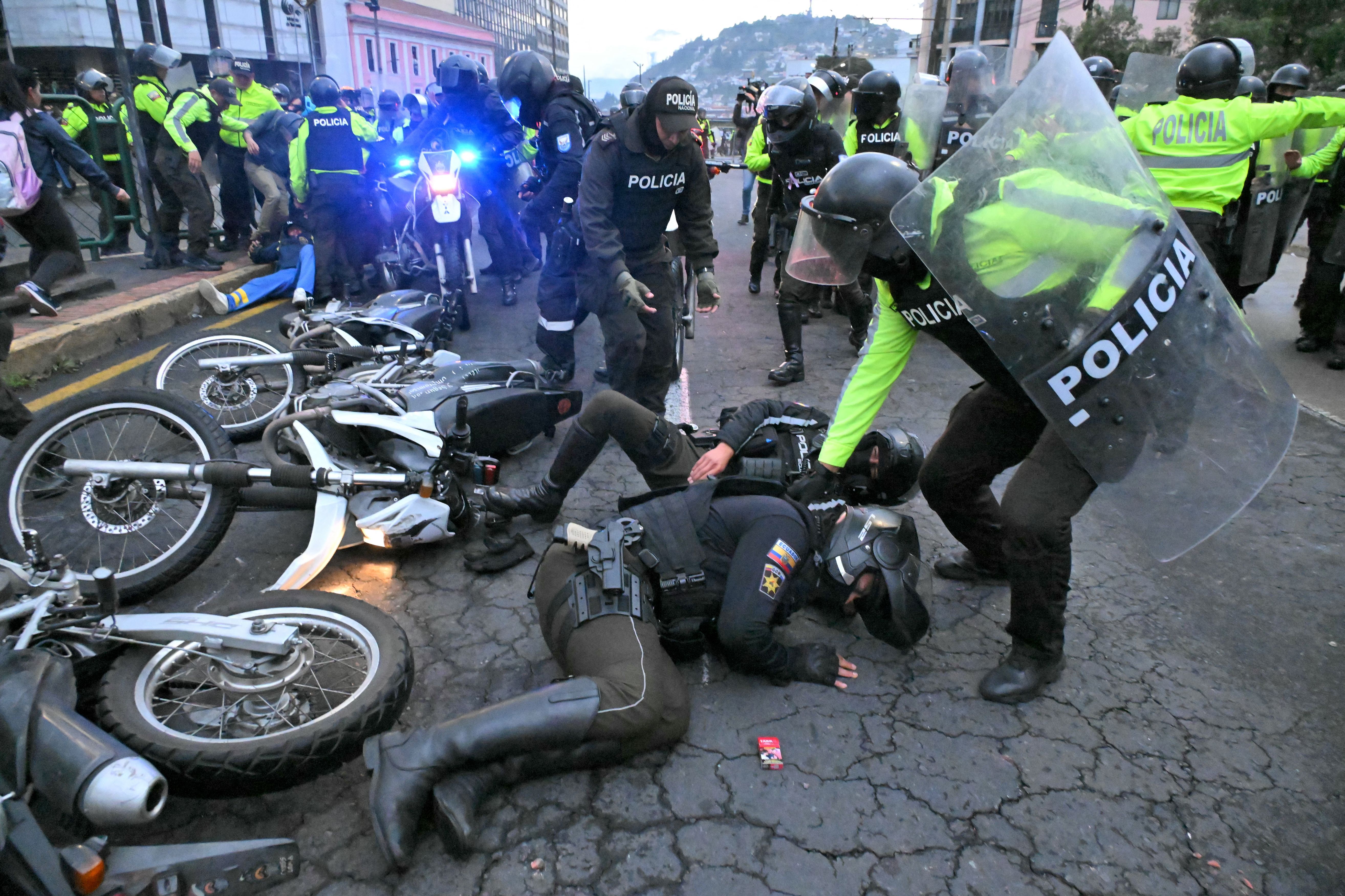 Police officers help injured colleagues after clashes erupted during a protest called by unions and social organizations against Daniel Noboa's government in downtown Quito on November 21, 2024. Drug-related violence, political turmoil, a faltering economy and blackouts lasting up to 14 hours a day mark the run-up to Ecuador's February presidential elections, in which President Daniel Noboa is seeking re-election. (Photo by Rodrigo Buendia/AFP Photo)