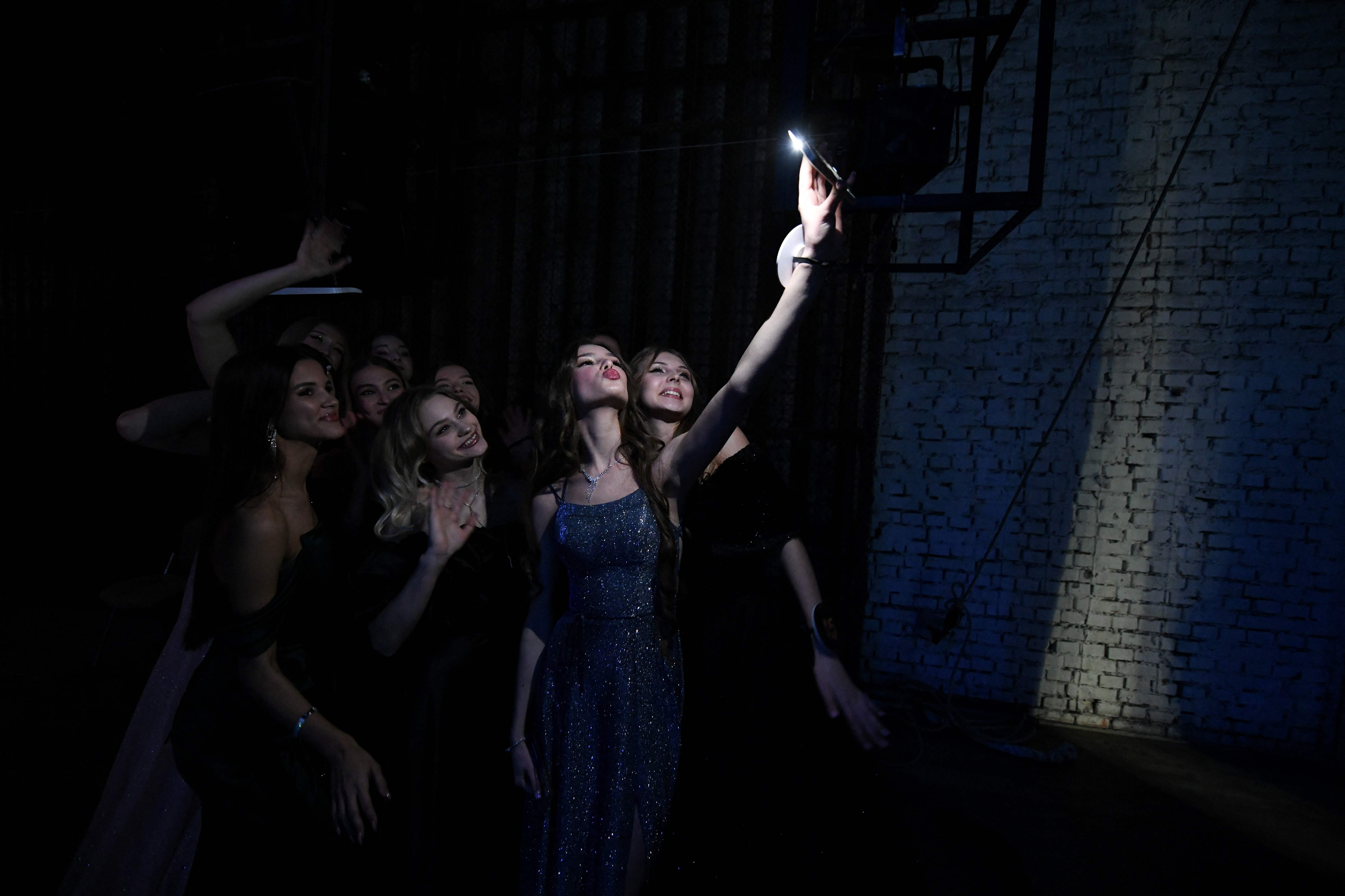 Participants take a selfie at the backstage of a contest “The Beauty of Donbass” in Donetsk, Russian-controlled Ukraine, on November 24, 2024, amid the Russia-Ukraine conflict. (Photo by AFP Photo/Stringer)
