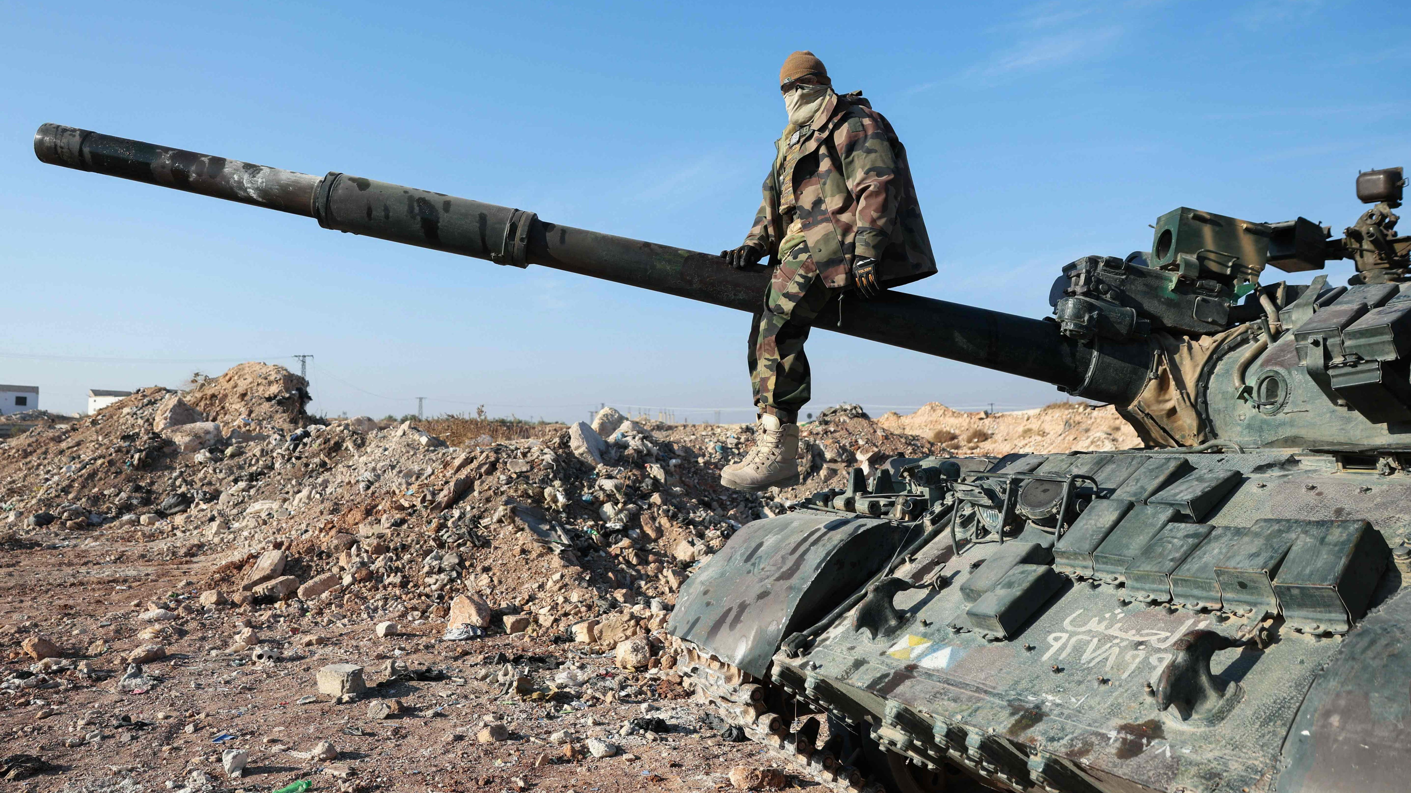 A militant poses for a picture after anti-government fighters seized Syrian army military equipment and vehicles that were abandoned on the highway to Damascus, as they reach the town of Suran north of Syria's Hama city on December 3, 2024. Islamist-led rebels advanced on Syria's fourth-largest city Hama on December 3, buoyed by their lightning capture of swathes of the north in an offensive that ended four years of relative calm. (Photo by Omar Haj Kadour/AFP Photo)