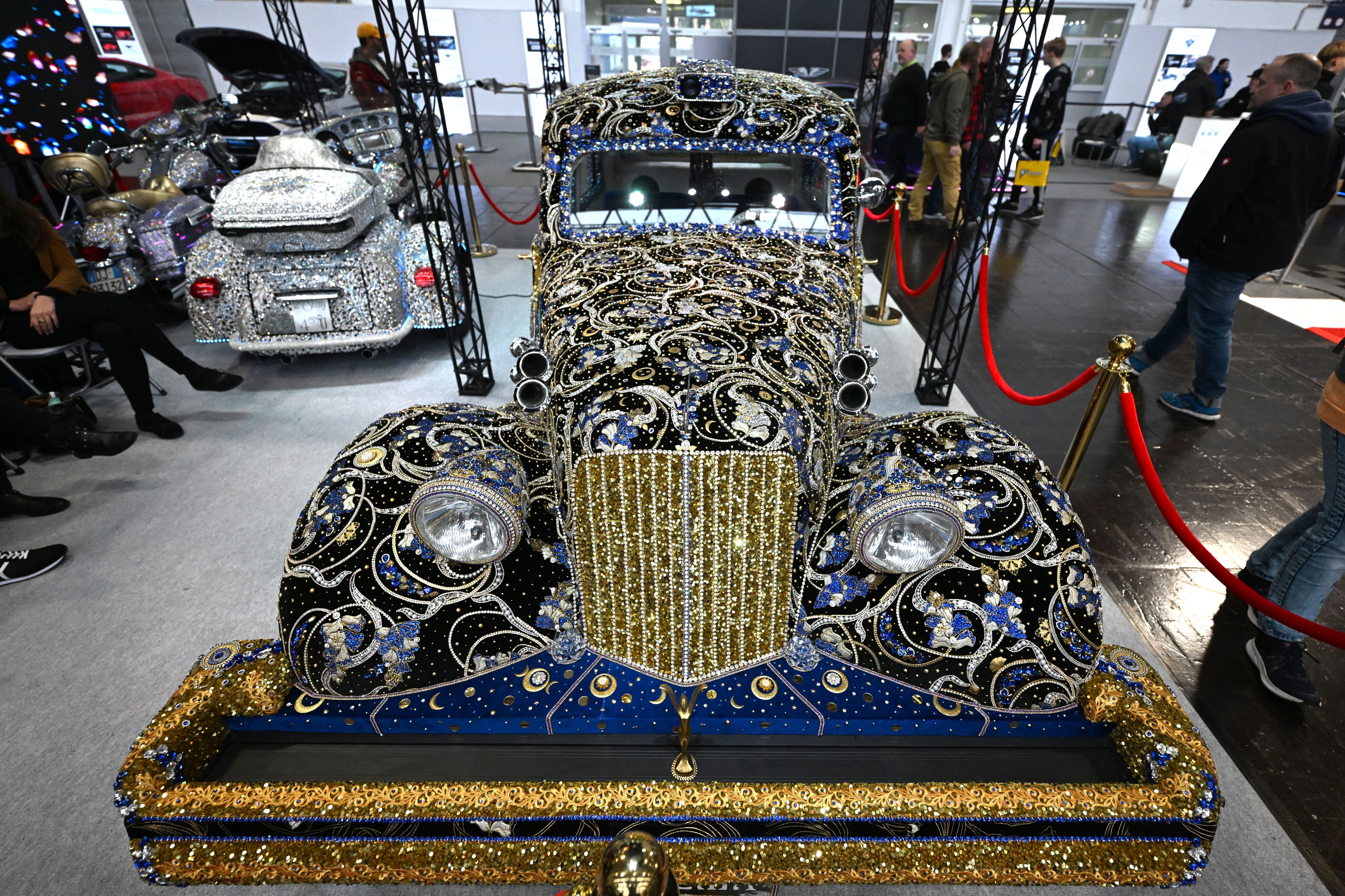 A vintage Citroen car decorated with gemstones is on display at the Essen Motor Show in Essen, western Germany on December 4, 2024. (Photo by Ina Fassbender/AFP Photo)