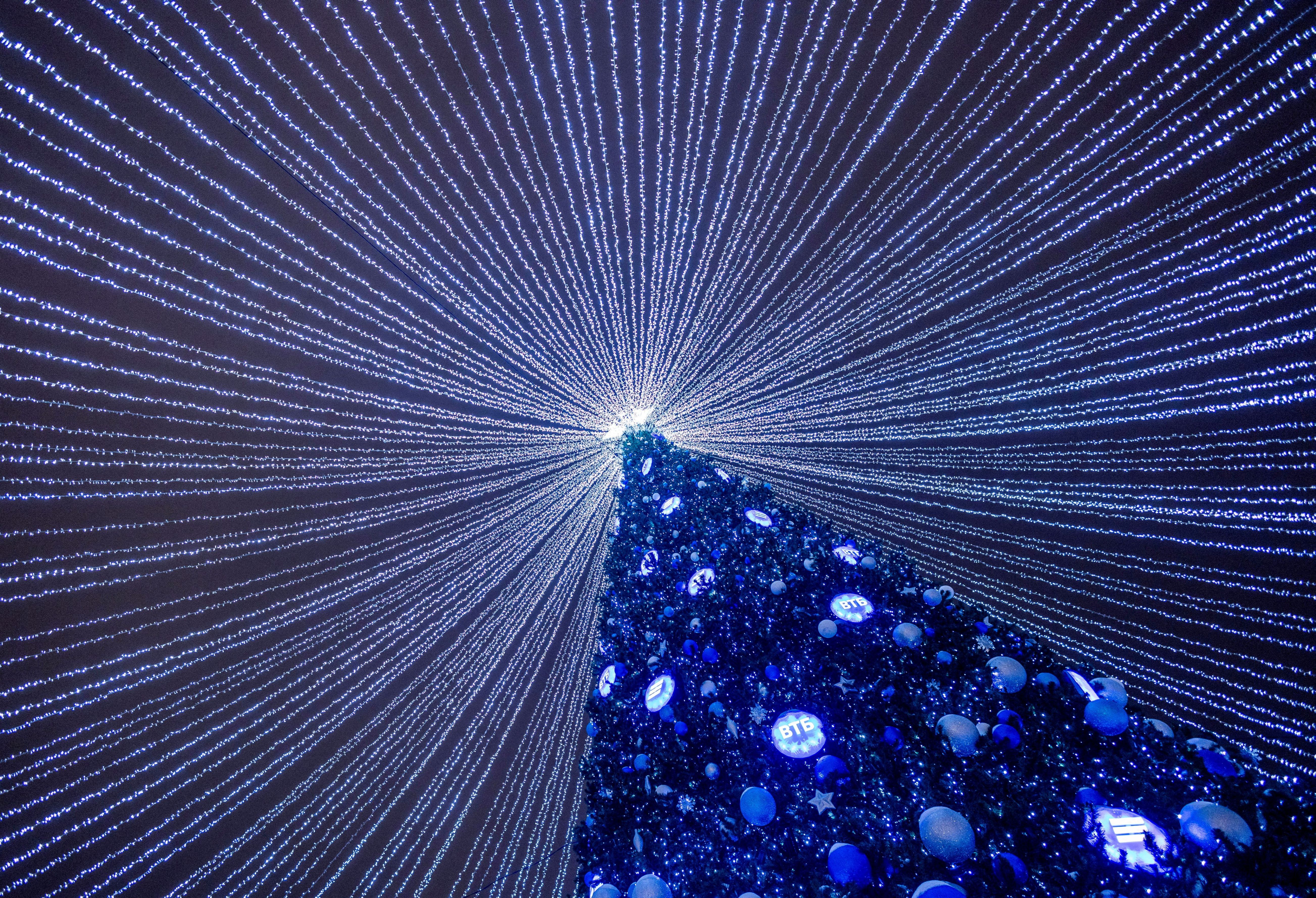 A view shows a Christmas tree, decorated with baubles showing the logo of VTB bank, in a street in Moscow, Russia, on December 11, 2024. (Photo by Maxim Shemetov/Reuters)