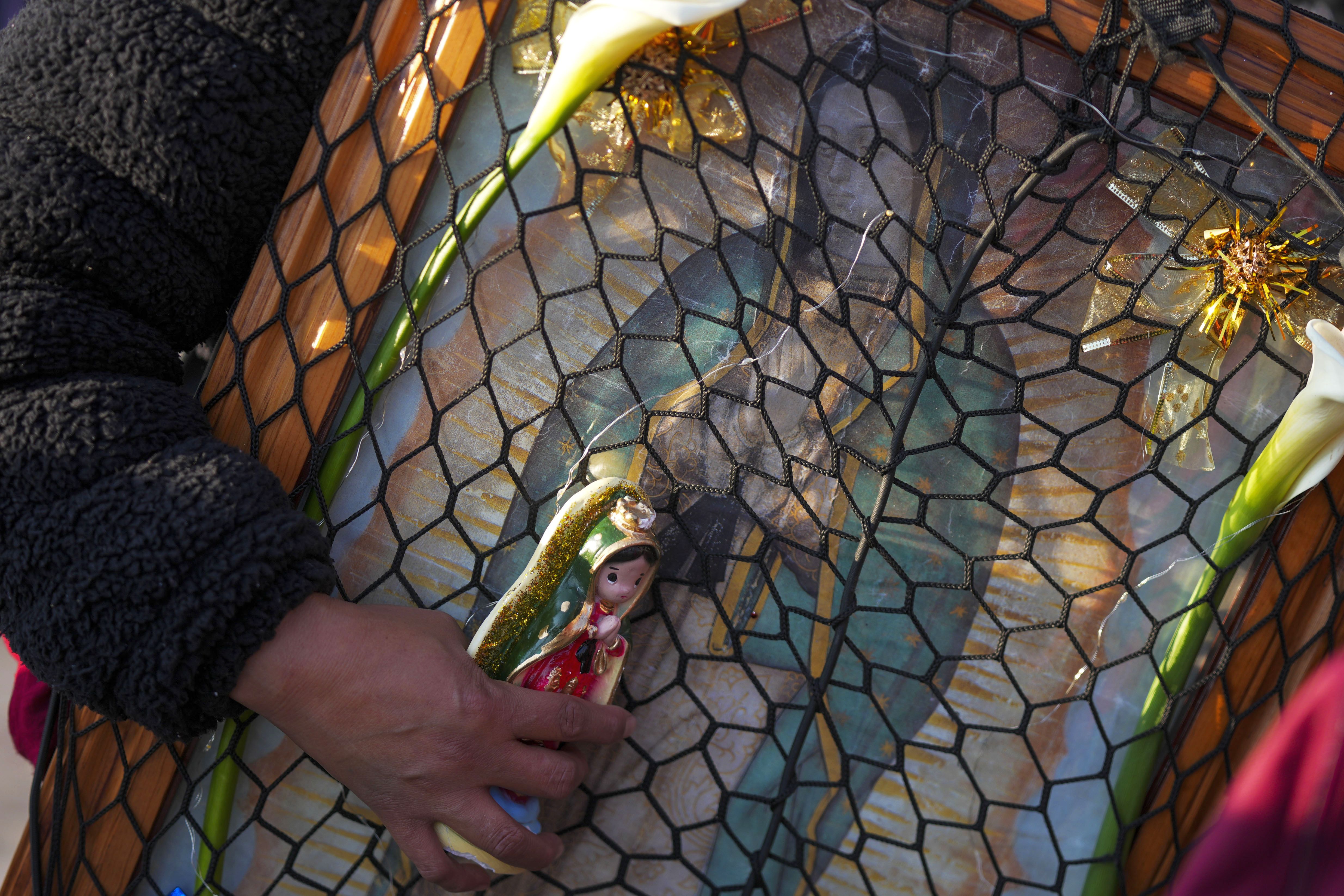 A pilgrim holds religious icons representing Our Lady of Guadalupe during one of the world's largest religious pilgrimages to Our Lady of Guadalupe Basilica, marking the feast day of the patroness of Latin America in Mexico City, Thursday, December 12, 2024. (Photo by Fernando Llano/AP Photo)
