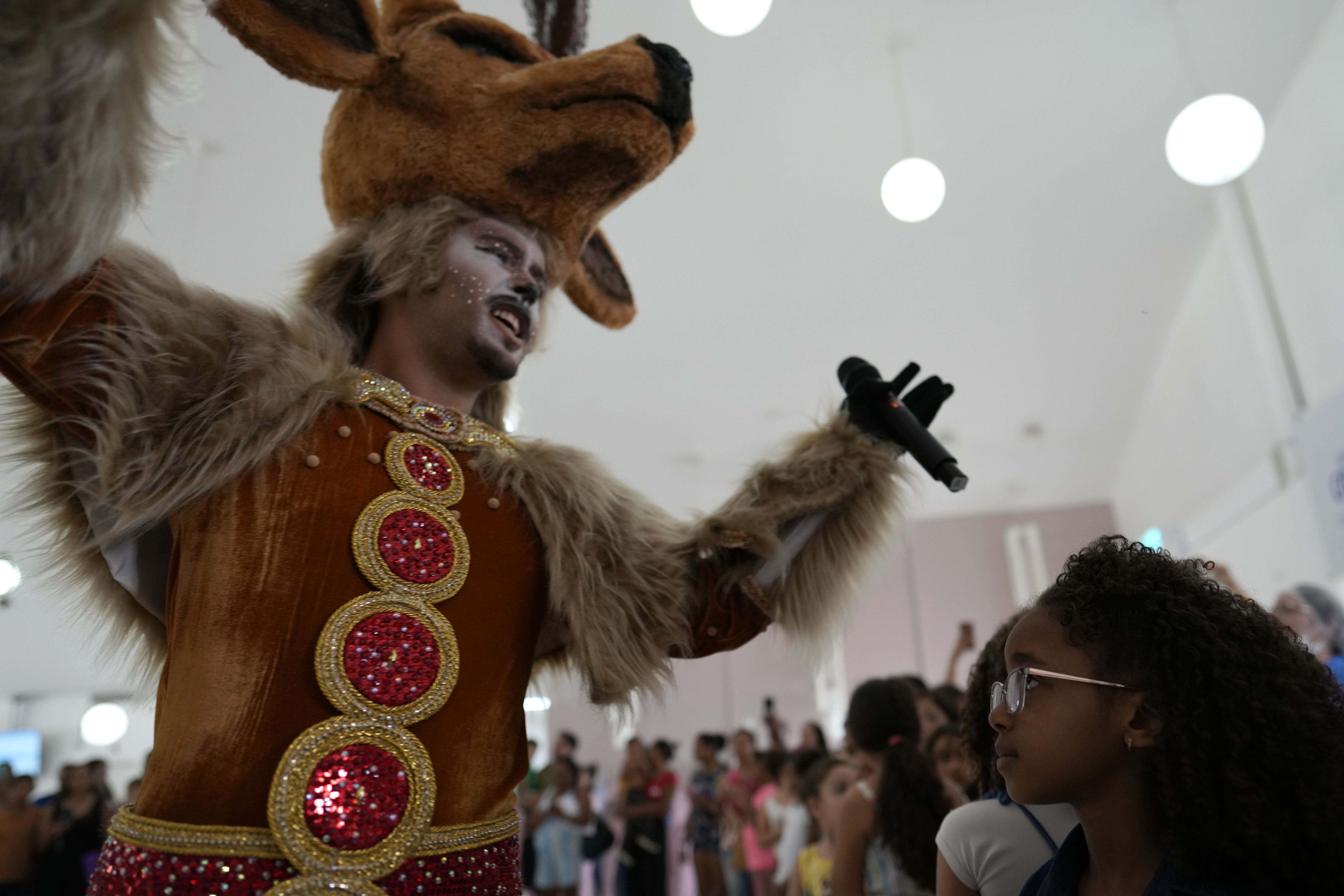 A person dressed as a reindeer sings for children being treated at the Children's Hospital during a Christmas event in Brasilia, Brazil, December 16, 2024. (Photo by Eraldo Peres/AP Photo)